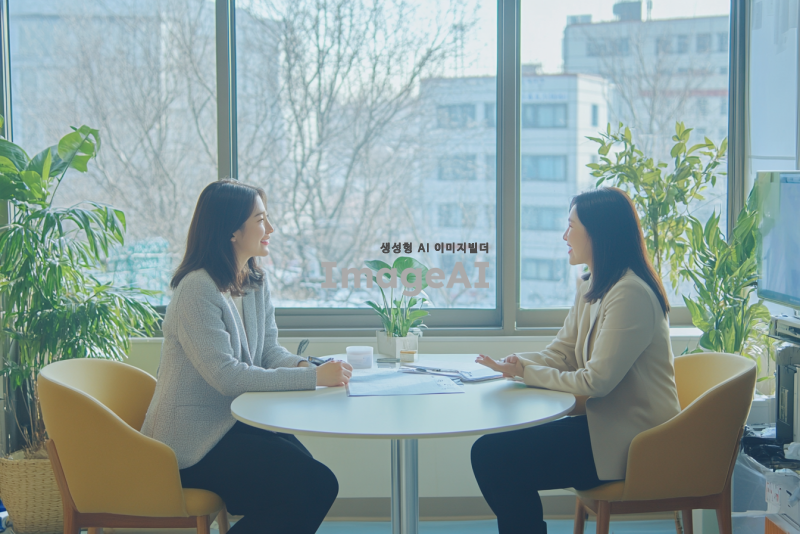 병원 상담실을 배경으로 테이블을 사이에 두고 한국인 여자 상담실장과 한국인 여자 환자가 상담하는 모습 밝고 편안한 분위기