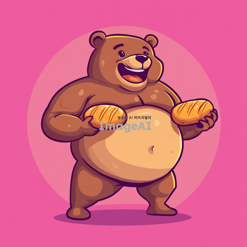 헬스하는 곰, 몸매가 좋은 피지크 스타일, 식스팩이 뚜렷한 근육맨 모습, 단순한 캐릭터 디자인, 빵을 먹고 있는 모습, 울룩불룩한 배, 귀여운 표정, 밝고 경쾌한 색감, 만화 스타일.