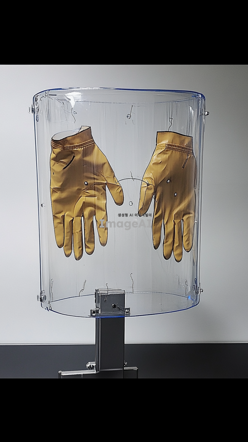 하부에 높낮이 조절이 가능한 지지대가 달린 유리방패, 유리 방패 중앙에 양 손을 넣을수있는 구멍이 있고 그 구멍에 고압 전기 작업용 절연 장갑이 부착되어 있음, 구멍에 손 넣으면 바로 장갑이 착용가능함