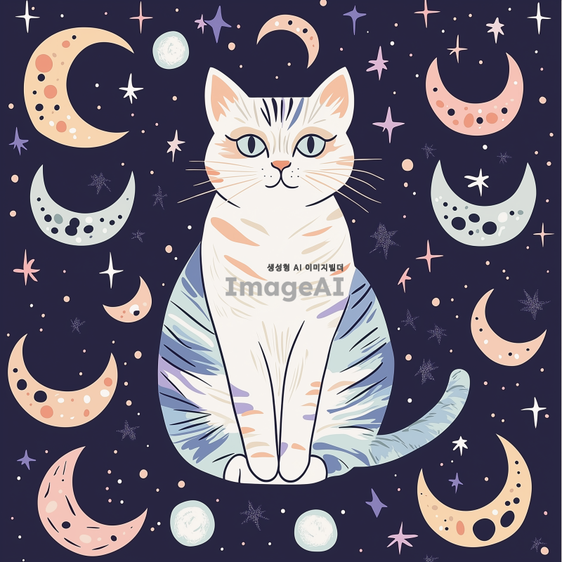 네이비색 배경에 고양이가 있는 이미지, 고양이 주변에 달 패턴이 흩어져 있는 모습, 고양이는 귀엽고 장난스러운 표정을 짓고 있으며, 달은 반달과 보름달 형태로 다양하게 배치되어 있음. 고양이의 털은 부드럽고 윤기나는 색상으로 표현되고, 배경의 네이비색은 깊고 풍부하게 나타나도록.