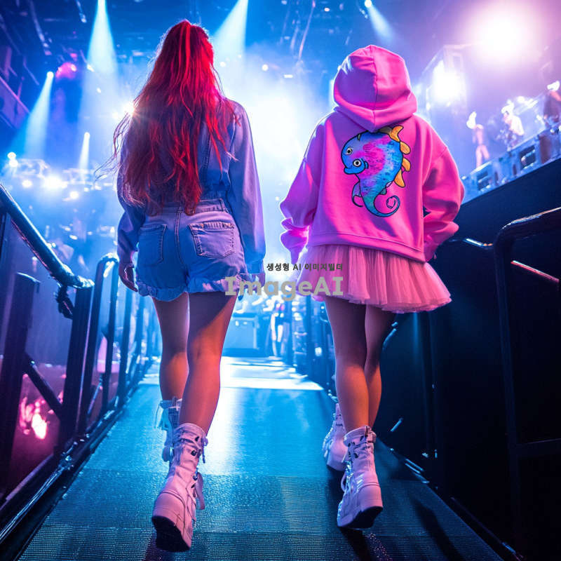 두 여자중 왼쪽 여자는 빨간 긴생머리에 파란색 멜빵바지를 입고있고 오른쪽 여자는 분홍색 오버핏 해마후드를 쓰고있고 분홍치마에 흰색 장화를 신고 있다 이 두여자의 뒷모습으로 눈부신 무대위를 걸어서 올라가는중이다.