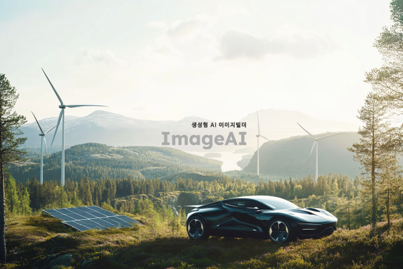 세련된 디자인의 풍력 자동차가 스웨덴의 아름다운 산지에서 자연과 조화를 이루며 주행하는 모습. 맑은 하늘과 푸른 숲, 그리고 멀리 보이는 산들이 배경을 이루고, 자동차는 최신 기술이 적용된 친환경적인 외관을 가지고 있다. 자동차 주변에는 바람개비와 태양광 패널이 어우러져 있는 풍경이 포함되어 있으며, 전체적으로 청정 에너지를 상징하는 이미지.