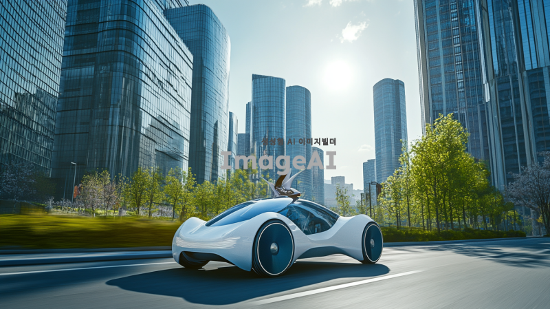 한국의 현대적인 도시 배경 속에서 바람의 힘을 이용해 움직이는 미래형 풍력자동차. 자동차는 유선형 디자인으로, 바람개비가 장착되어 있어 바람을 받아들이는 모습. 차량 주변에는 푸른 자연과 함께 고층 빌딩이 조화를 이루고, 맑은 하늘 아래에서 햇빛이 반사되는 장면. 자동차의 색상은 밝은 파란색과 흰색의 조화로, 친환경적인 느낌을 강조.