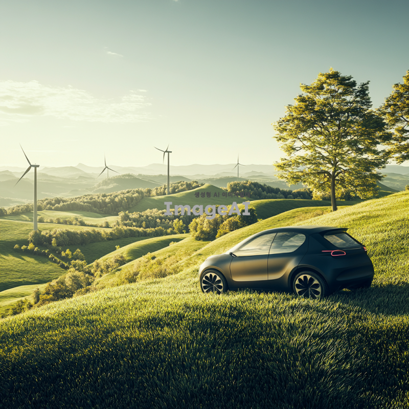 친환경 풍력자동차가 푸른 언덕을 힘차게 오르고 있는 모습. 맑은 하늘 아래 햇빛을 받아 반짝이는 풍력자동차의 디자인과 함께, 주변에 펼쳐진 푸른 자연경관. 바람에 흔들리는 나무와 풀, 그리고 멀리 보이는 풍력 발전기들이 조화를 이루는 장면.