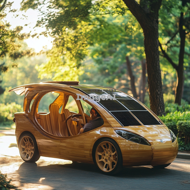 태양열 패널이 장착된 나무로 만들어진 자동차, 자연 친화적인 디자인, 푸른 숲 배경, 햇빛이 비치는 따뜻한 분위기, 한국인 운전자가 웃으며 운전하는 모습, 친환경적인 기술을 강조한 세련된 외관.