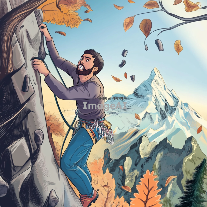 입냄새가 심한 남성이 히말라야 산맥을 등산하는 모습, 험준한 산악 배경, 눈 덮인 봉우리와 푸른 하늘, 남성은 등산 장비를 착용하고 힘든 표정을 지으며 오르는 모습, 주변에는 바람에 흔들리는 나무와 바위들이 보임, 생생한 자연의 색감과 극적인 조명 효과
