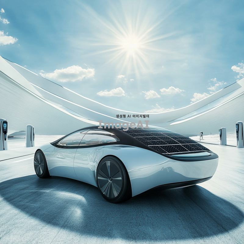 신재생 에너지를 활용한 현대적인 자동차 디자인, 매끄러운 곡선과 미래적인 외관, 태양광 패널이 장착된 지붕, 전기 충전소와 함께 있는 도시 풍경, 밝고 청명한 하늘 아래 주행 중인 모습, 친환경적인 느낌을 강조한 색상과 재질 사용, 한국의 도로 환경을 반영한 배경.