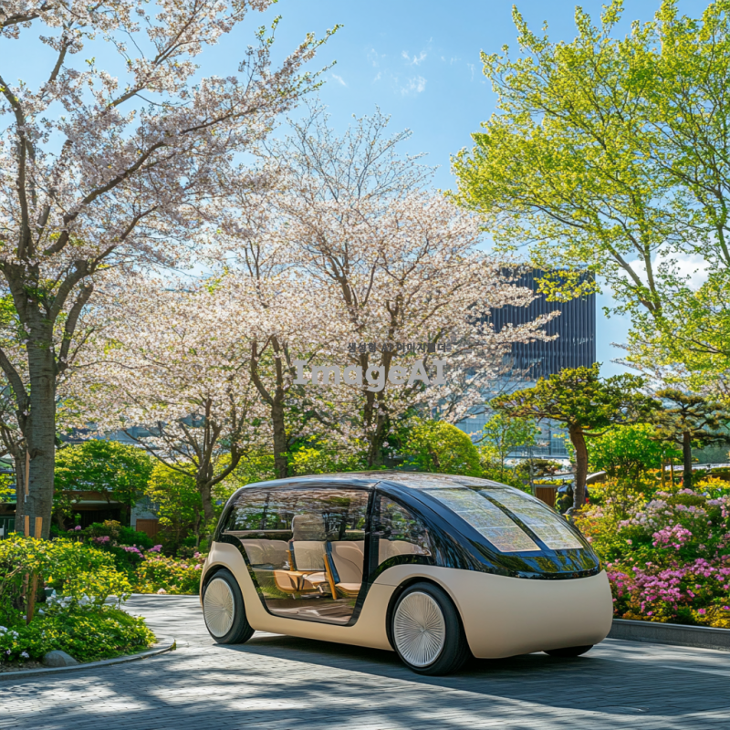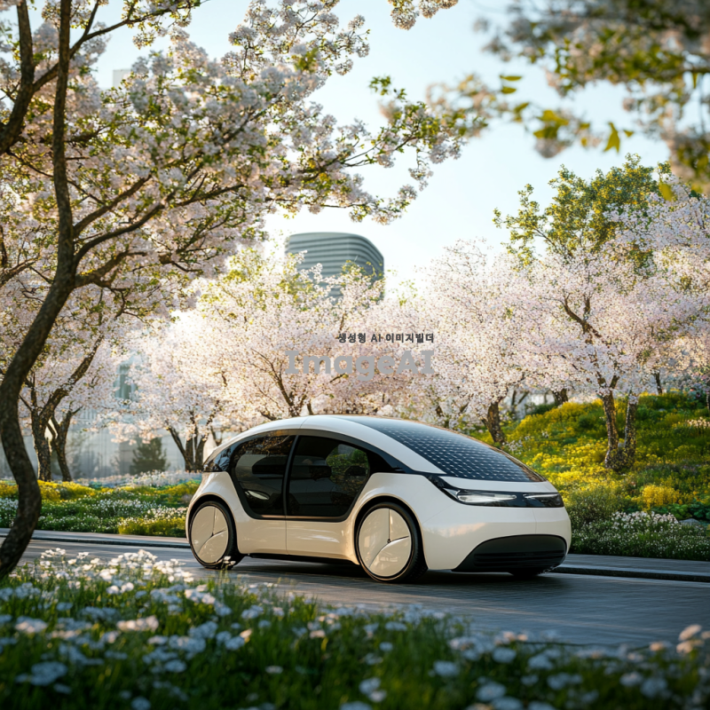 친환경 에너지를 사용하는 자동차가 도심의 푸른 공원 옆에 주차되어 있는 모습. 자동차는 현대적이고 세련된 디자인으로, 태양광 패널이 장착되어 있으며, 주변에는 나무와 꽃들이 만발해 있는 풍경. 맑은 하늘과 자연의 조화가 잘 어우러진 장면.