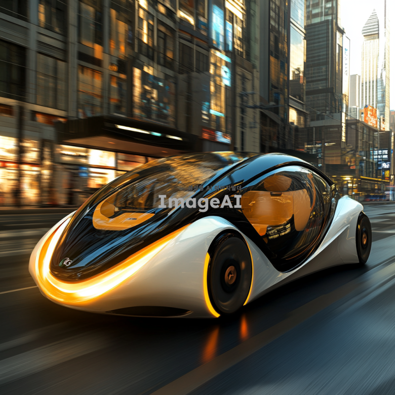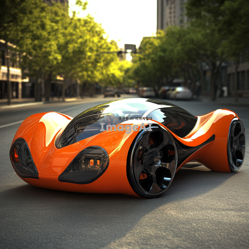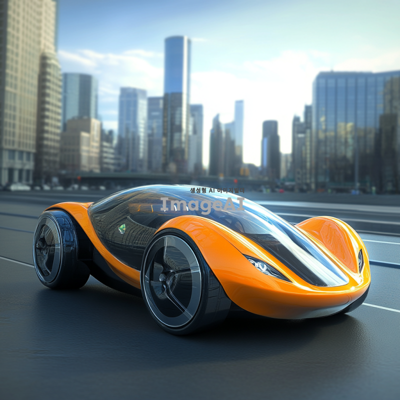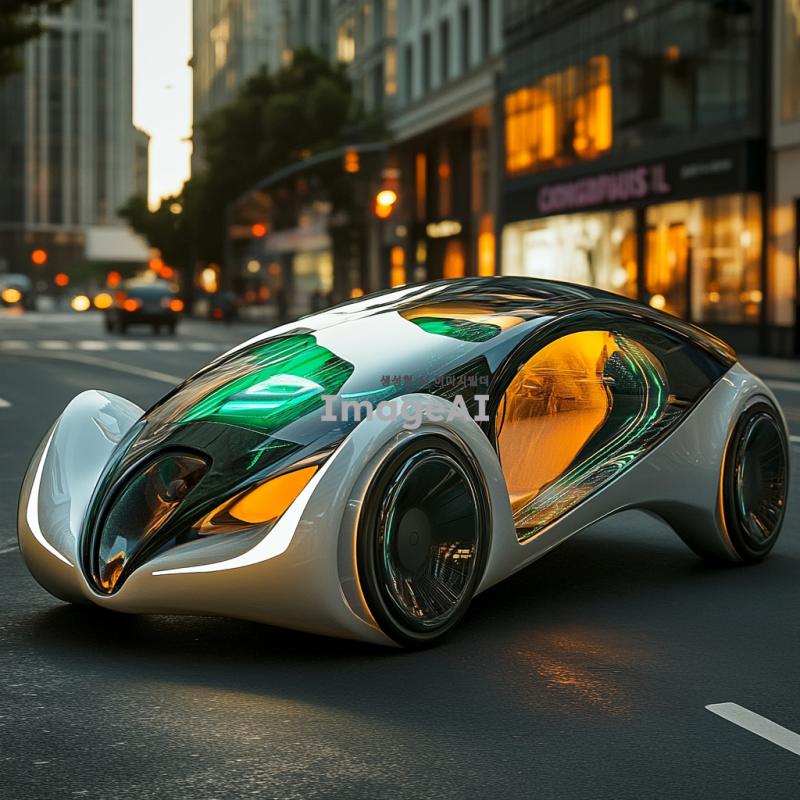 깔끔하고 현대적인 디자인의 풍력 자동차, 20대들이 선호할 만한 스타일, 미래지향적인 요소, 유선형의 차체, 밝고 화사한 색상 조합, 환경 친화적인 이미지, 도시 배경 속에서 주행하는 모습, 세련된 디테일과 독특한 청춘같은 느낌의 디자인 특징 강조