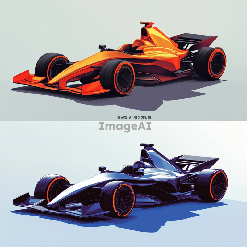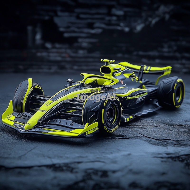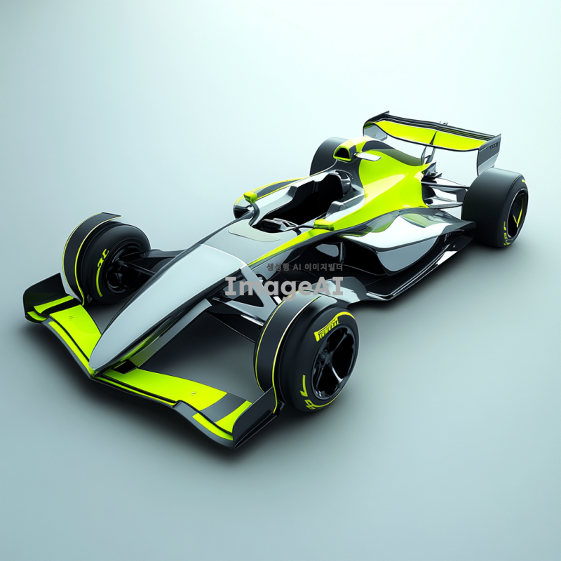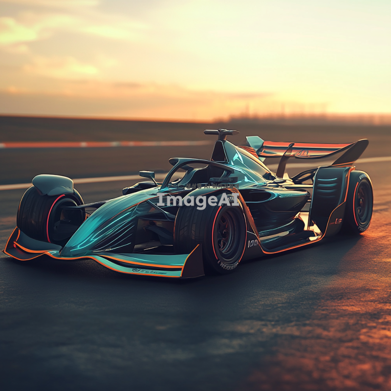 풍력으로 움직이는 F1 레이싱 자동차, 역동적인 주행 모습, 세련된 디자인과 강렬한 색상, 스포티한 느낌