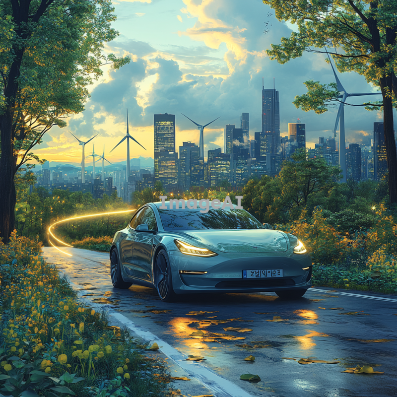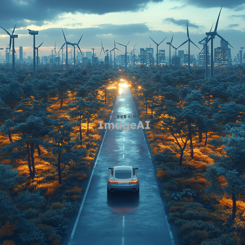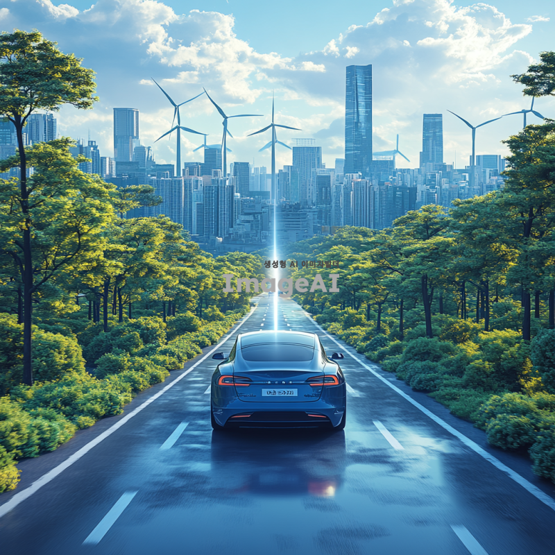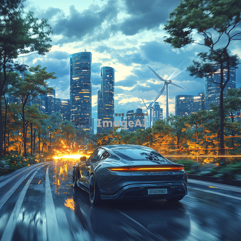 한국의 현대적인 도시 배경 속에서 풍력 터빈이 설치된 도로를 달리는 자동차를 그려주세요. 자동차는 에너지를 효율적으로 사용하는 모습으로, 차량의 외관은 세련되고 미래지향적인 디자인을 가지고 있습니다. 자동차의 주변에는 푸른 하늘과 구름, 그리고 바람에 흔들리는 나무들이 함께 어우러져 있습니다. 풍력 터빈이 돌아가는 모습과 함께, 자동차가 에너지를 활용해 에너지빔을 쏘게 해주새요