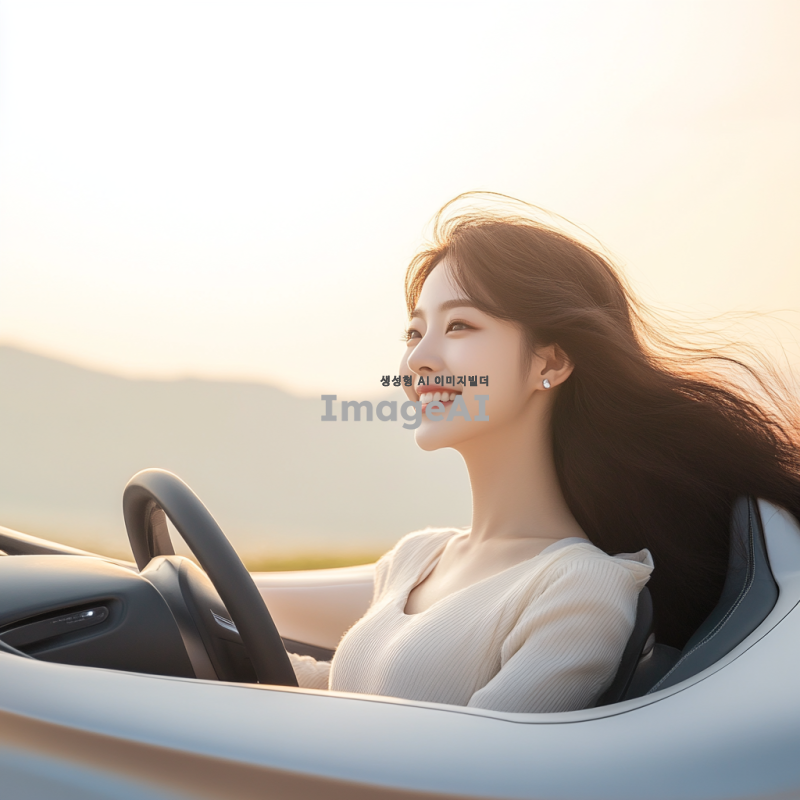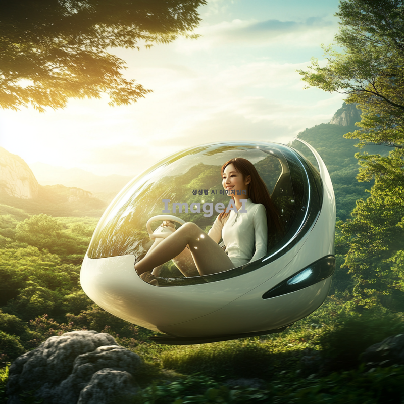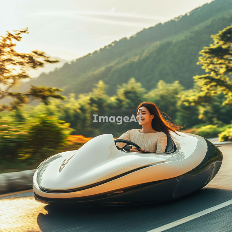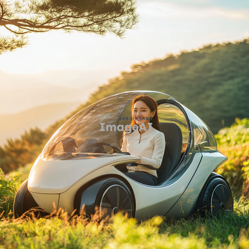 친환경적인 디자인의 아름다운 한국 여성, 풍력으로 움직이는 미래형 자동차를 타고 있는 모습, 푸른 자연 배경, 햇살이 비치는 맑은 하늘, 자동차는 현대적이고 세련된 형태, 여성은 미소를 지으며 자동차를 조종하고 있는 모습, 자연과 조화를 이루는 느낌.