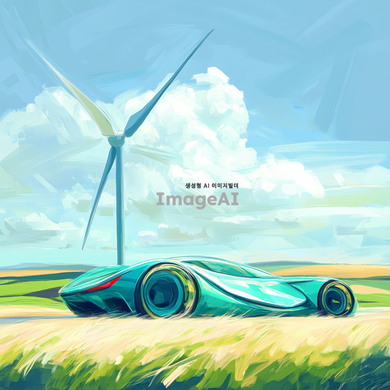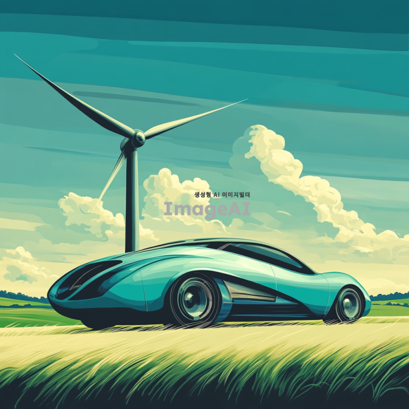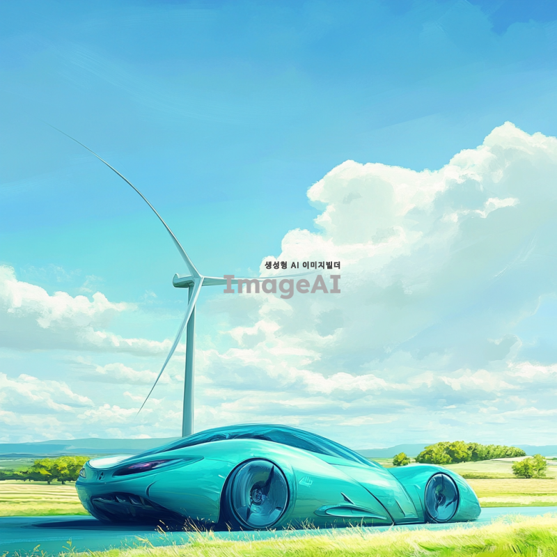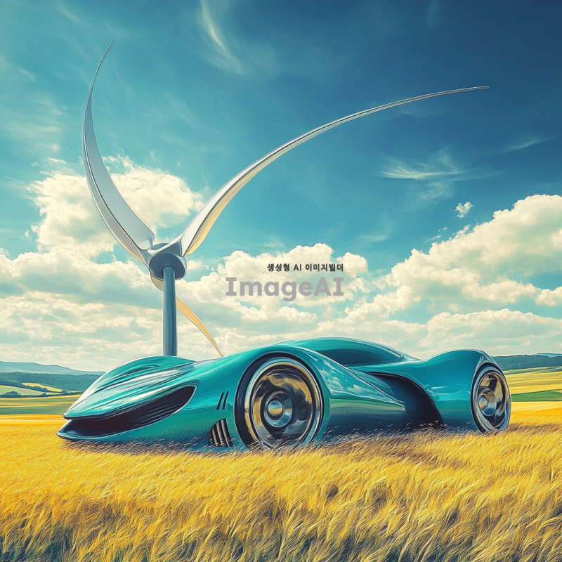 풍력 에너지를 활용하여 움직이는 미래형 자동차의 모습을 그려주세요. 차체는 유선형 디자인으로, 바람을 받는 큰 풍력 터빈이 차 뒤쪽에 장착되어 있습니다. 자동차의 색상은 청록색으로, 자연과 조화를 이루는 느낌을 줍니다. 배경은 푸른 하늘과 구름이 있는 풍경으로, 자동차가 넓은 초원 위를 달리고 있는 장면을 담아주세요.