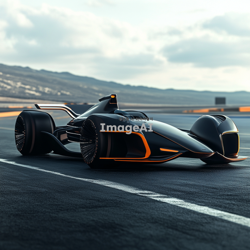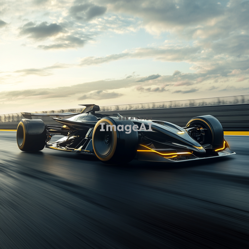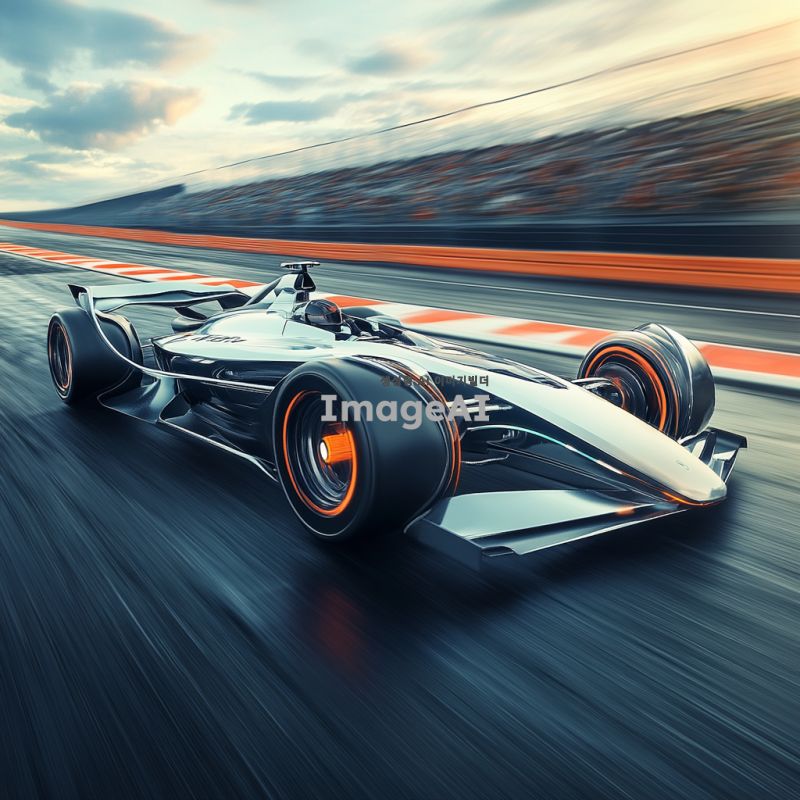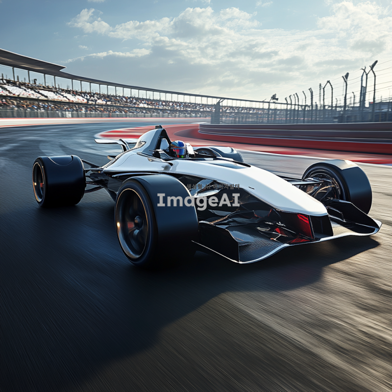풍력으로 움직이는 F1 레이싱용 자동차, 현대적인 디자인과 미래적인 요소가 결합된 모습, 경주 트랙, 빠른 속도로 달리는 자동차의 역동적인 모습, 에너지 효율성을 강조한 차량의 세부 디자인