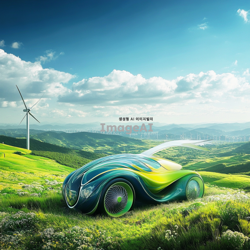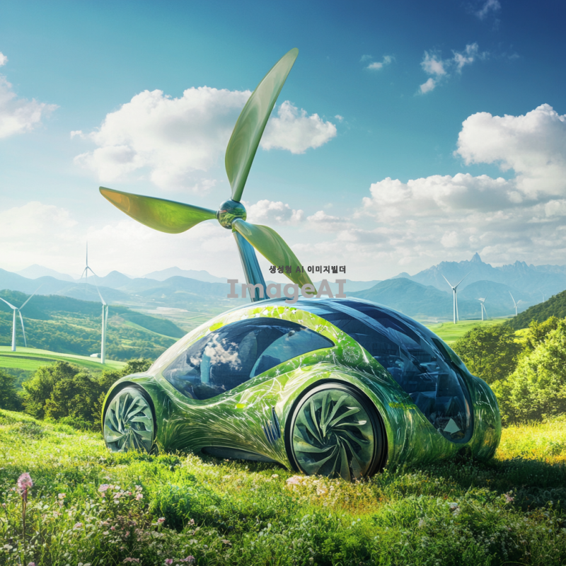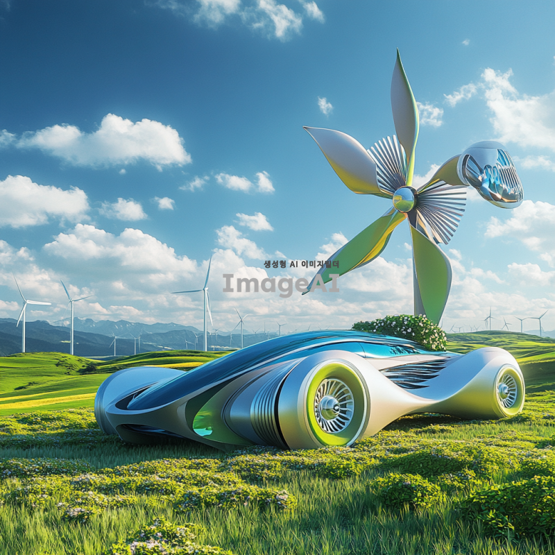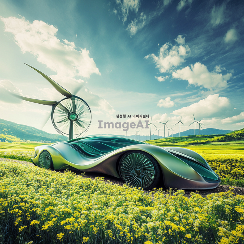 한국의 푸른 들판을 배경으로 한 미래적인 풍력 자동차. 자동차의 디자인은 유선형으로, 바람개비와 같은 풍력 발전기가 차량의 지붕에 장착되어 있다. 차량의 색상은 자연과 어우러지는 초록색과 파란색으로 조화롭게 배치되어 있으며, 주변에는 푸른 하늘과 구름이 떠 있는 모습이 보인다. 자동차가 바람을 받으며 달리는 모습과 함께, 풍력 발전소가 멀리 배경에 보이는 장면을 담아낸다.