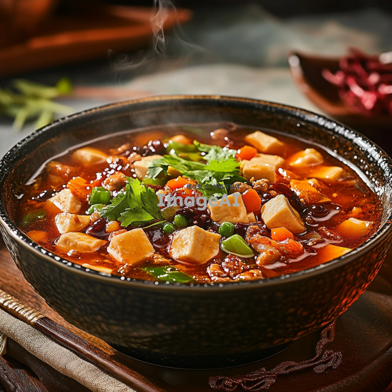 매콤하고 향긋한 마라탕 한 그릇, 다양한 재료가 가득 담긴 모습, 신선한 채소와 두부, 고기, 매운 소스가 어우러진 모습, 따뜻한 김이 나는 그릇, 배경은 아늑한 중국식 식당, 맛있고 풍성한 느낌을 강조하여 표현.