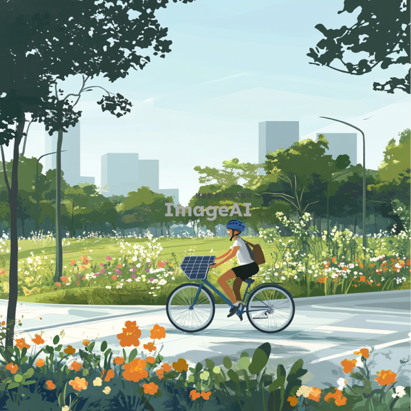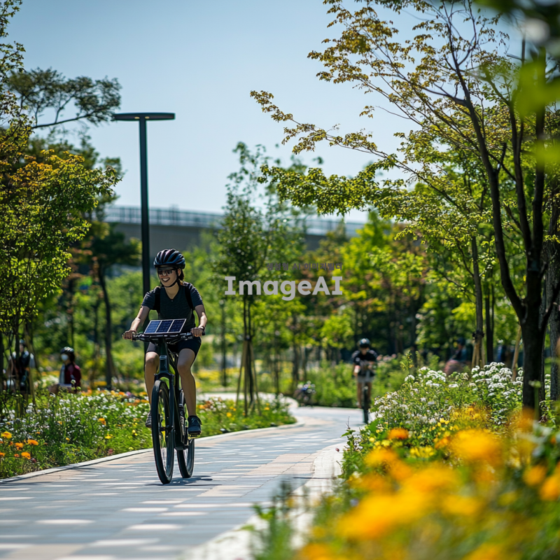 친환경 자전거가 도심의 공원에서 주행하고 있는 모습, 푸른 나무와 꽃들이 가득한 배경, 햇살이 비치는 맑은 날씨, 자전거에 장착된 태양광 패널과 재활용 소재로 만들어진 디자인, 행복한 표정의 한국인 라이더가 헬멧을 쓰고 자전거를 타고 있는 장면.