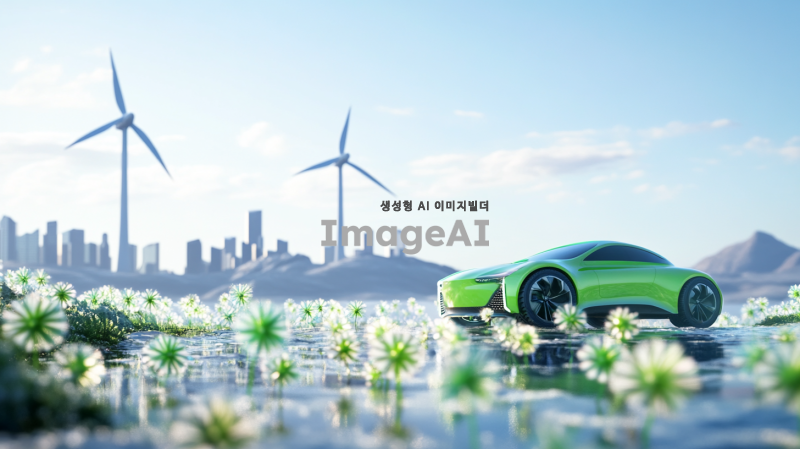 초록색 풍력자동차가 바람을 이용해 달리는 모습, 현대적인 디자인과 친환경적인 요소가 강조된 차량, 푸른 하늘과 맑은 자연 배경, 바람개비와 함께하는 풍력 발전의 상징적인 이미지, 미래 지향적인 도시 풍경과 조화롭게 어우러진 장면.