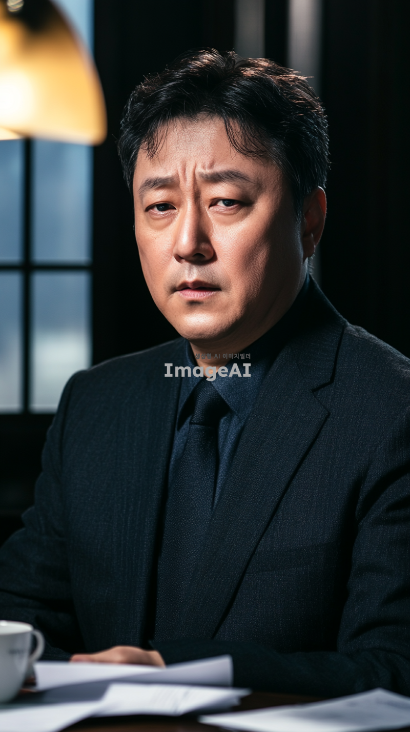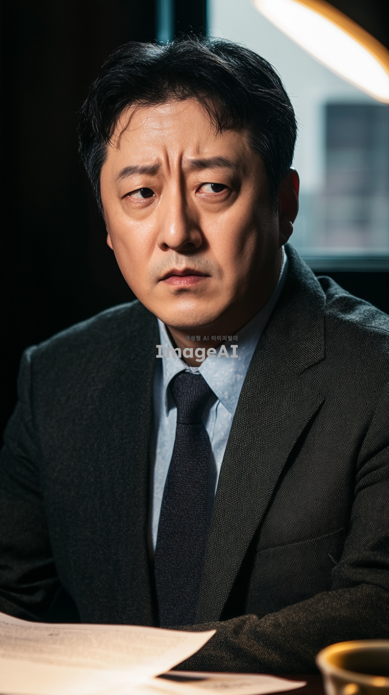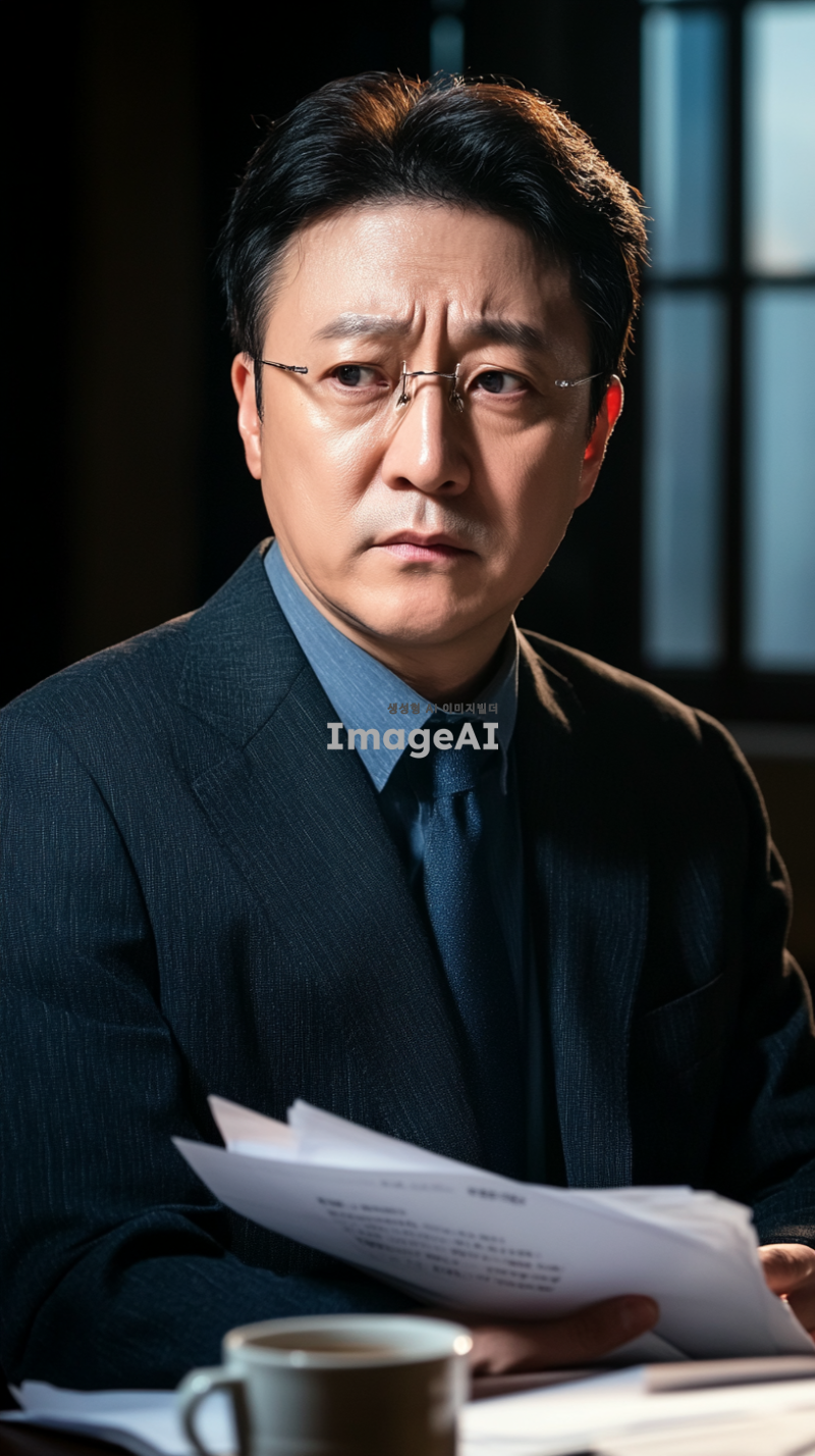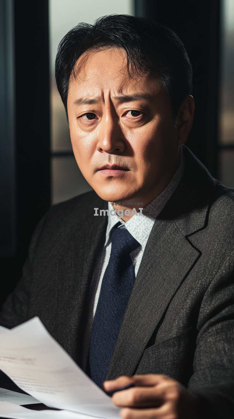 고소장을 받고 고민에 빠진 한국 남성의 모습, 중년의 남자가 어두운 방에서 고소장을 바라보며 깊은 생각에 잠겨 있는 장면, 그의 표정은 걱정과 불안이 섞여 있고, 주변에는 서류와 커피잔이 흩어져 있는 모습, 조명이 어두워서 분위기가 긴장감이 감도는 느낌, 현실적인 스타일로 표현.