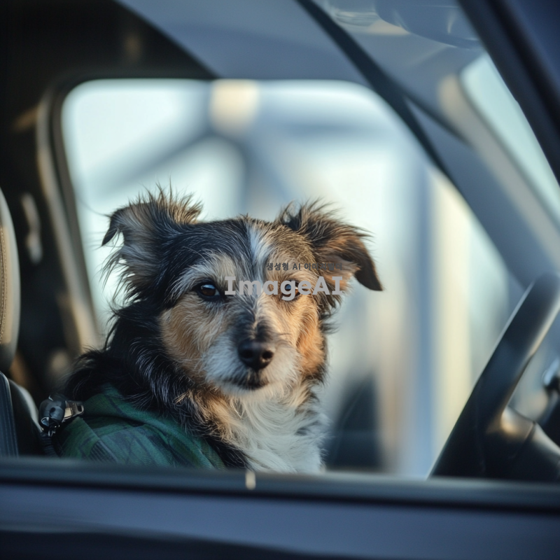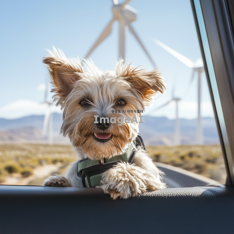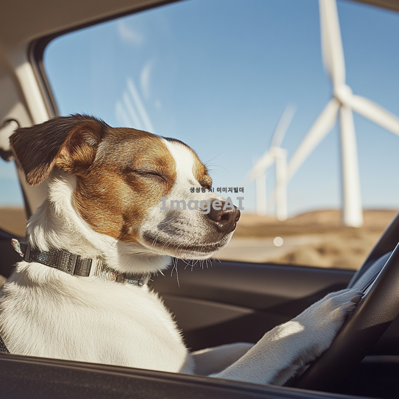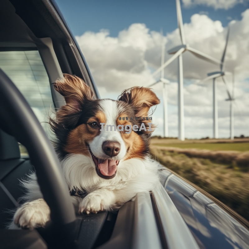 풍력에너지를 이용해 달리고있는 자동차를 타고있는강아지