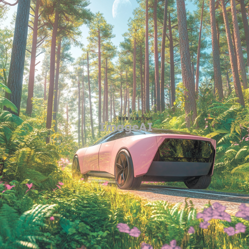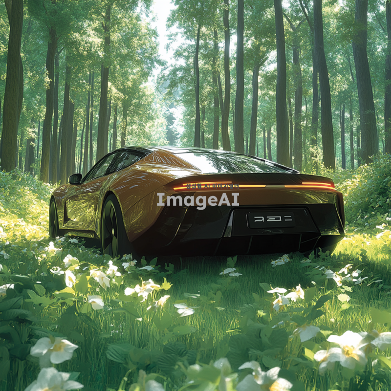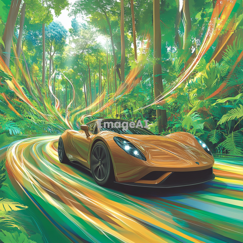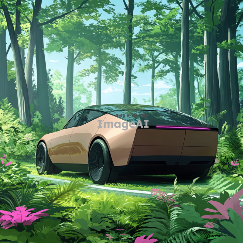 친환경 기술을 적용한 현대적인 디자인의 자동차가 푸른 숲속의 도로를 시속 100km로 달리고 있는 모습. 자동차는 전기차로, 주변에는 다양한 식물과 나무들이 무성하게 자생하고 있으며, 맑은 하늘과 햇살이 비추고 있다. 자동차의 외관은 유선형이며, 자연과 조화를 이루는 색상으로 꾸며져 있다.