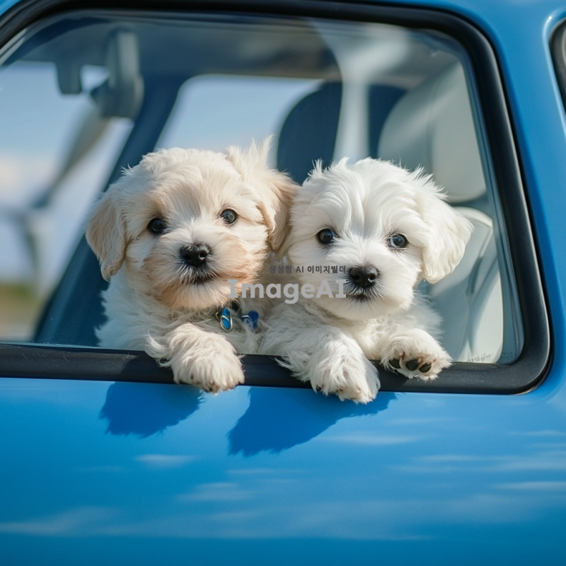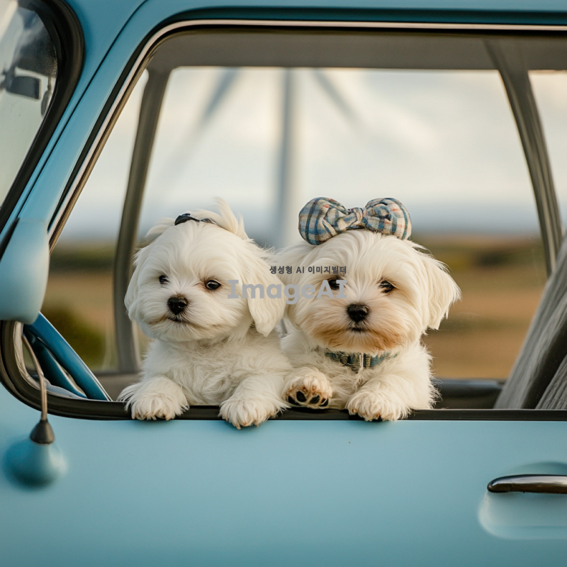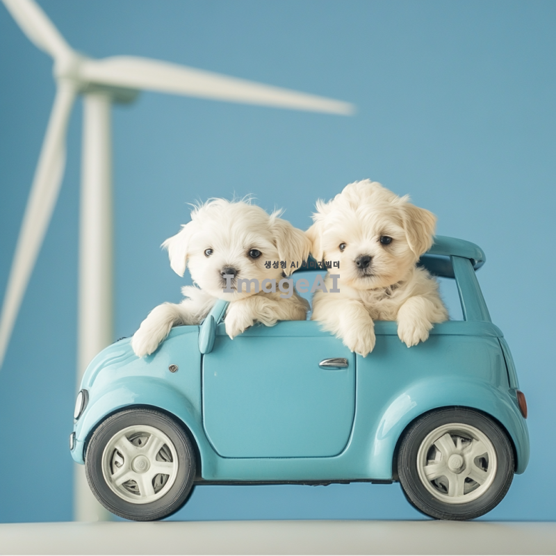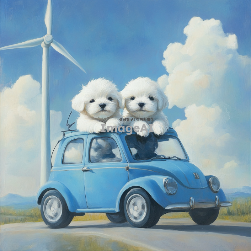 풍력에너지를 사용해 달리고있는 파란색 자동차를 타고있는 말티즈 강아지들