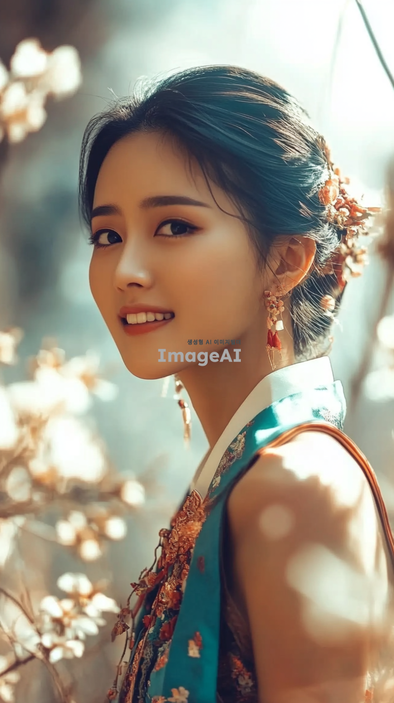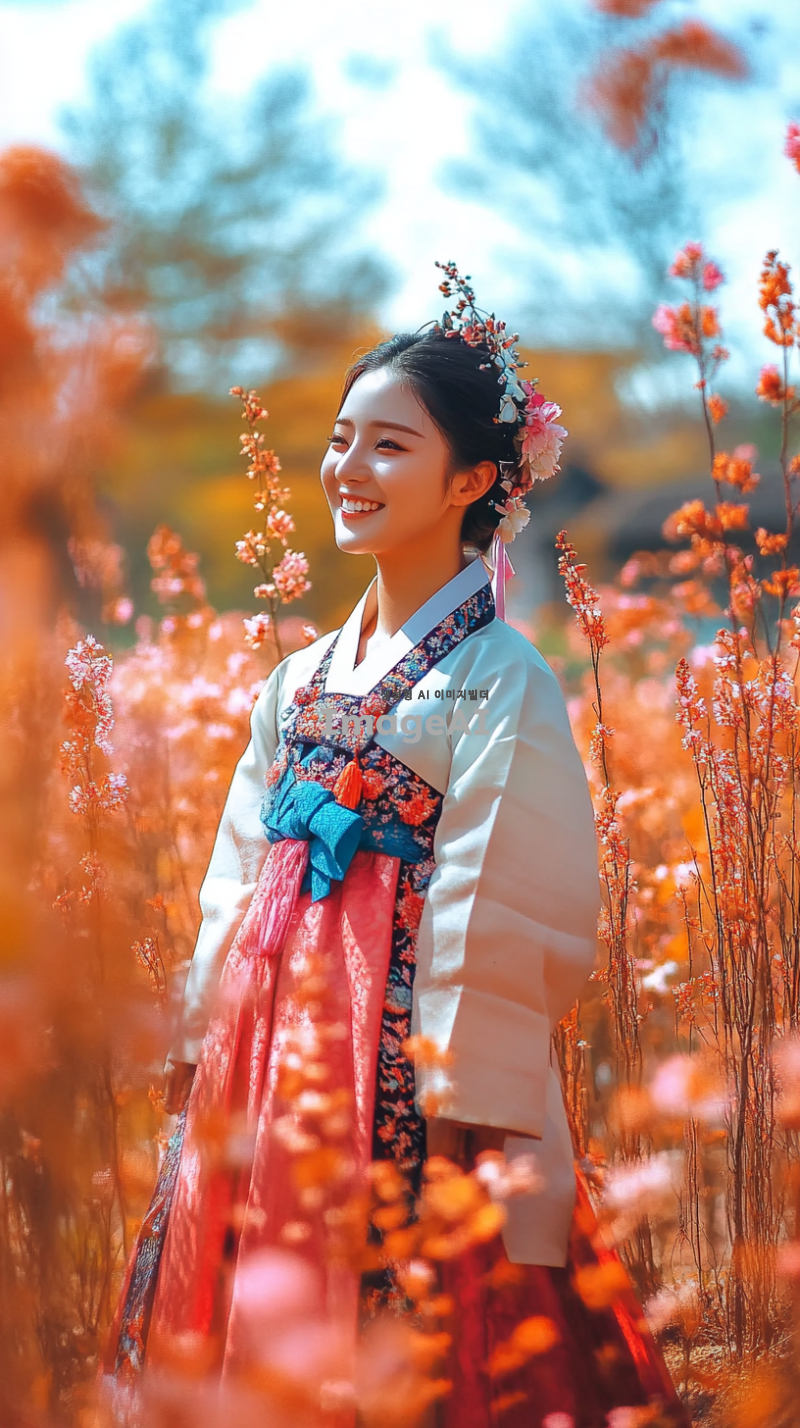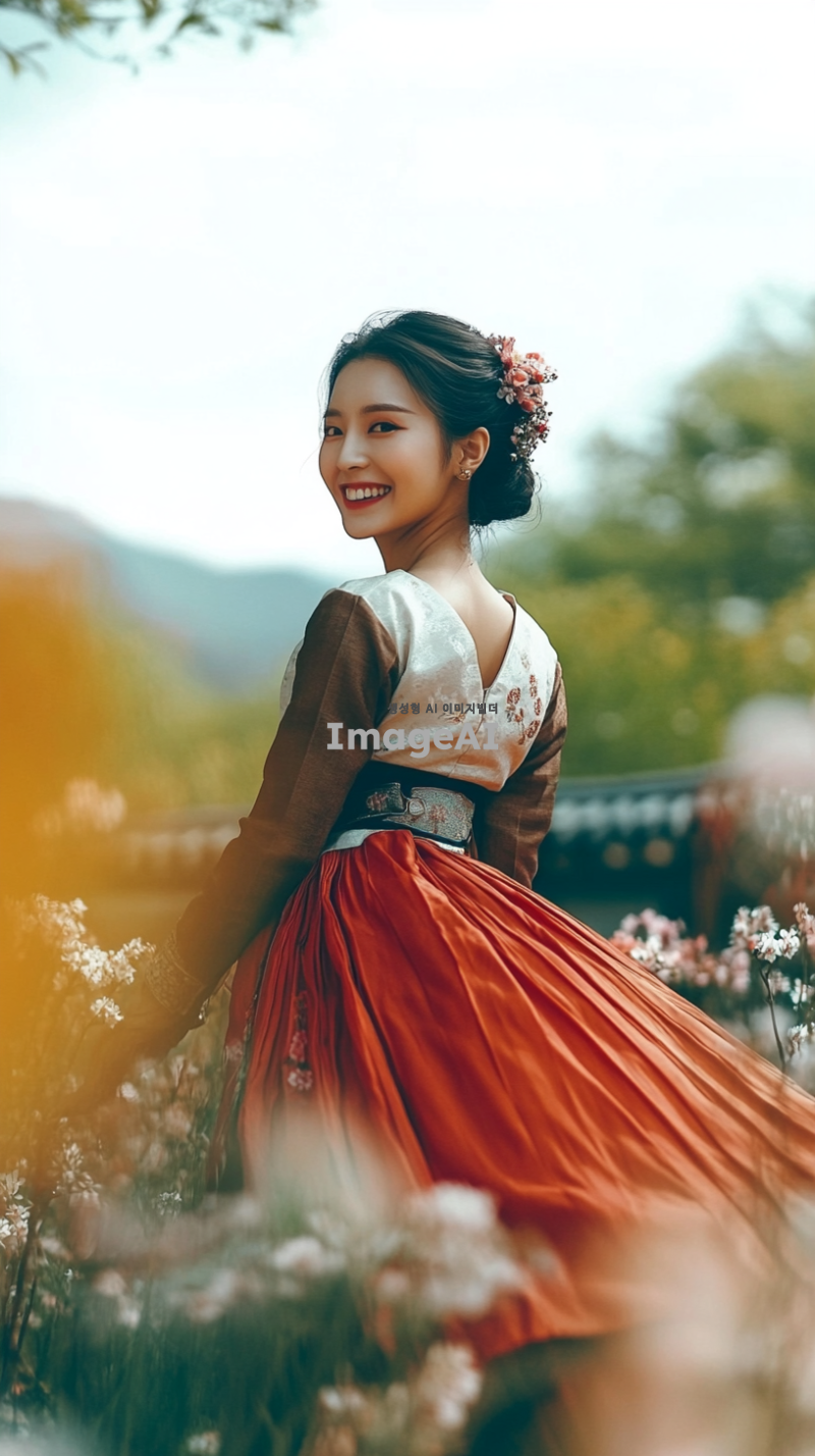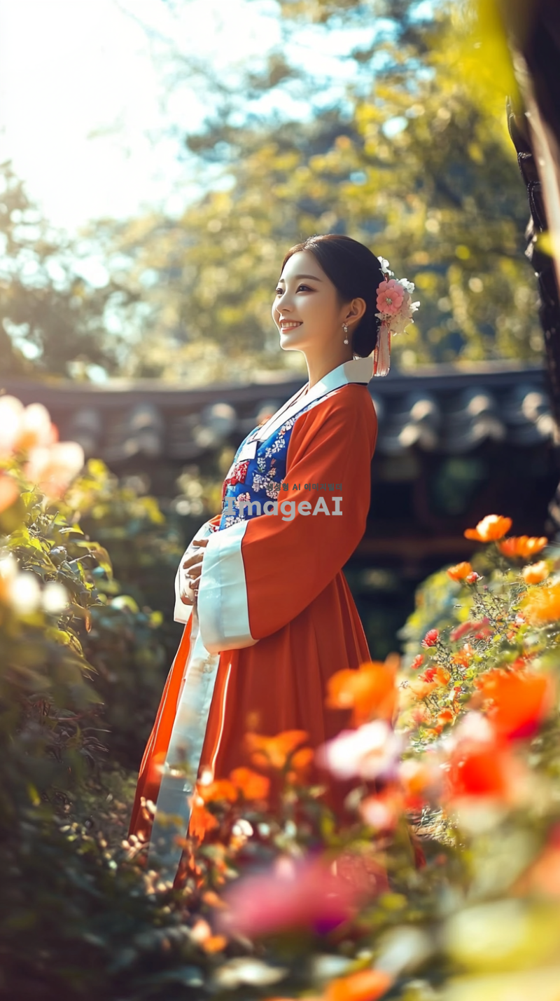 황지원, 한국의 전통 의상을 입고 있는 젊은 여성, 아름다운 자연 배경에서 미소를 지으며 서 있는 모습, 따뜻한 햇살이 비추는 가운데, 꽃들이 만발한 정원에서 전통적인 한국의 아름다움을 강조한 장면.