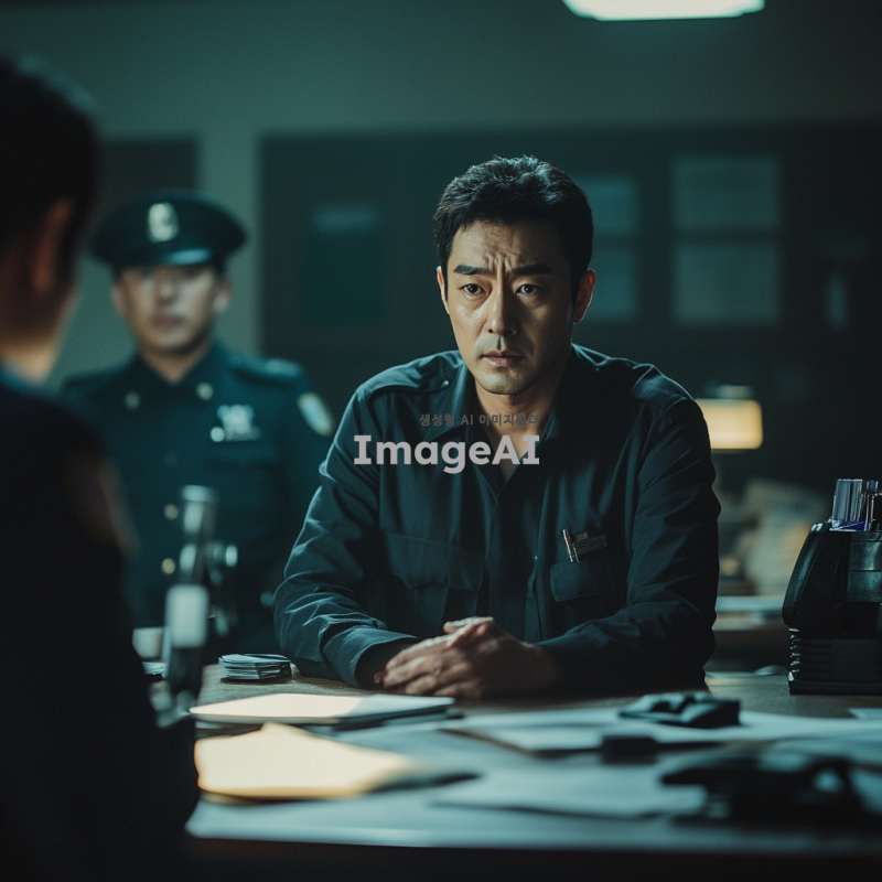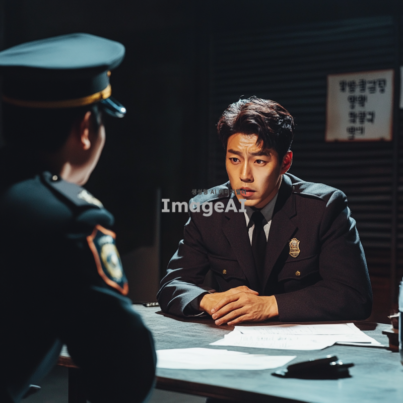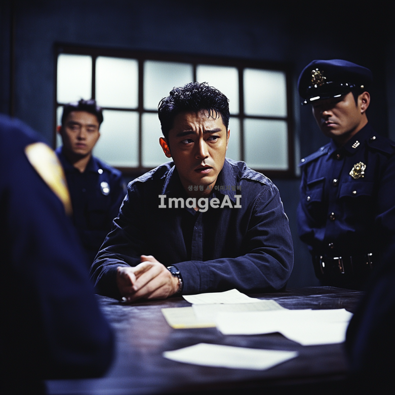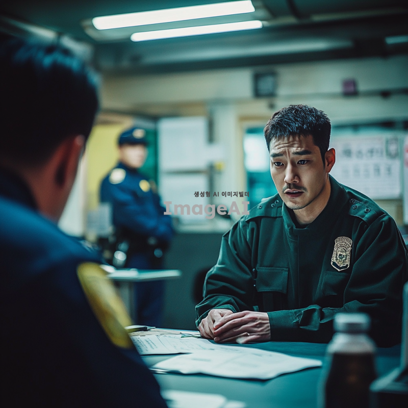 남자가 경찰서에서 경찰에게 조사를 받고 있는 장면, 긴장한 표정의 한국 남자, 경찰복을 입은 경찰관이 질문하는 모습, 주변에 경찰서 내부의 장비와 서류가 있는 상황, 조명이 밝고 분위기는 엄숙한 느낌, 남자의 손은 테이블 위에 놓여 있고, 경찰관은 진지한 표정으로 남자를 바라보고 있음.