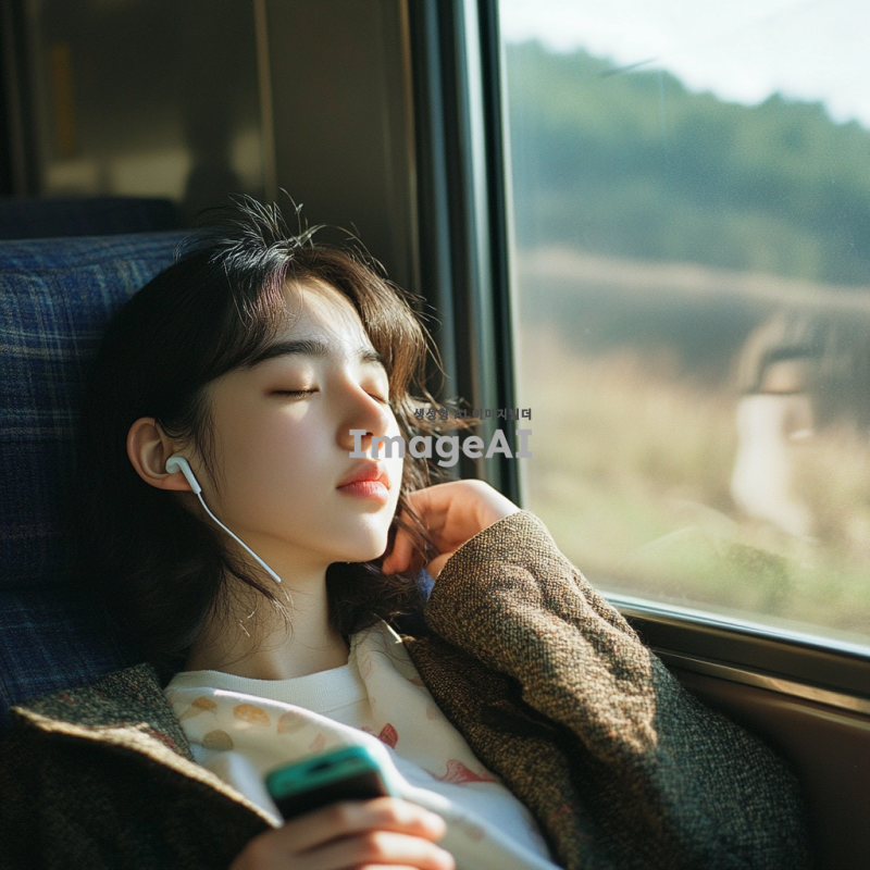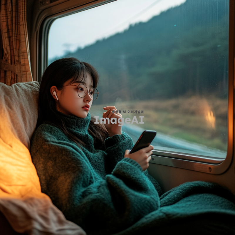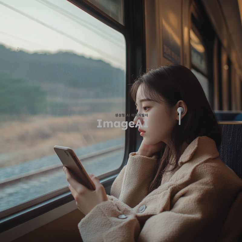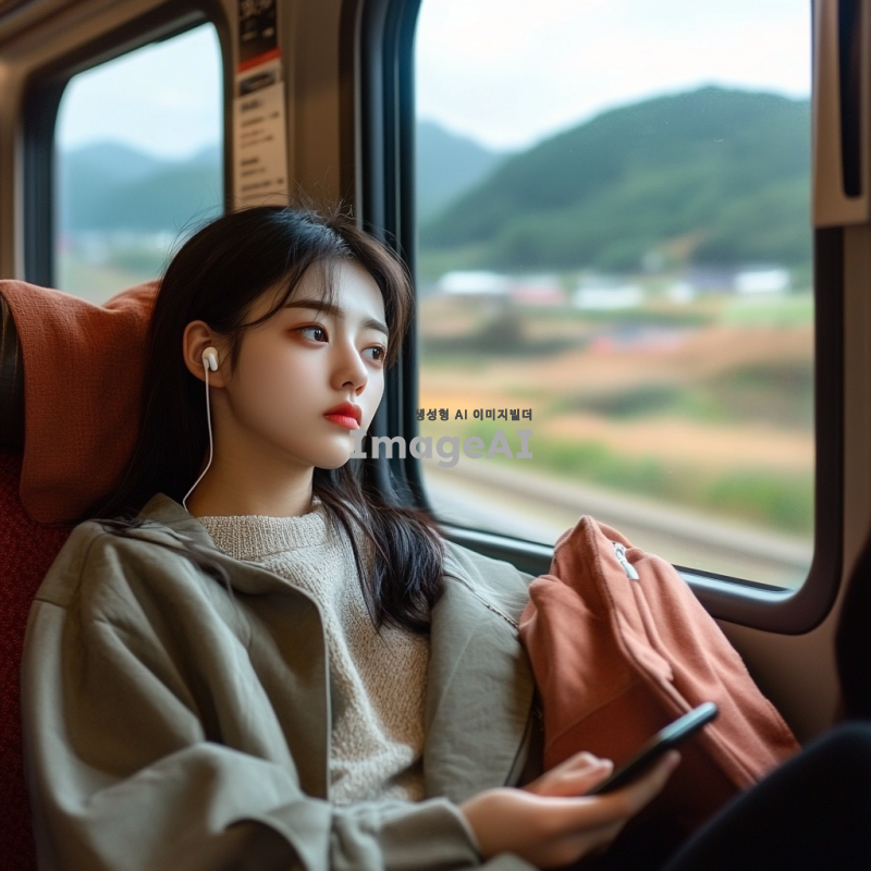 여행 중 지루해하는 한국인 청소년, 창밖을 바라보며 생각에 잠겨 있는 모습, 다양한 배경의 풍경이 지나가는 기차 안, 편안한 복장, 스마트폰을 들고 있는 모습, 감정이 담긴 표정, 에어팟을 끼고있는 모습, 따뜻한 조명과 부드러운 색감으로 아늑한 분위기 연출.
