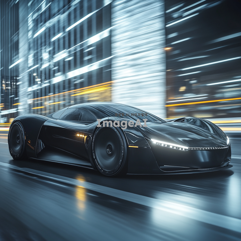 날렵하고 세련된 디자인의 매트한 검은색 풍력자동차, 역동적인 자세로 주행 중인 모습, 현대적인 도시 배경, 미래적인 느낌, 공기역학적 형태, 세밀한 디테일 강조, 강렬한 조명 효과
