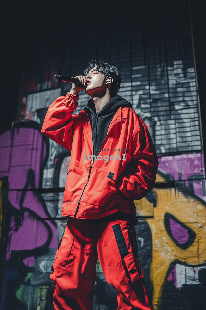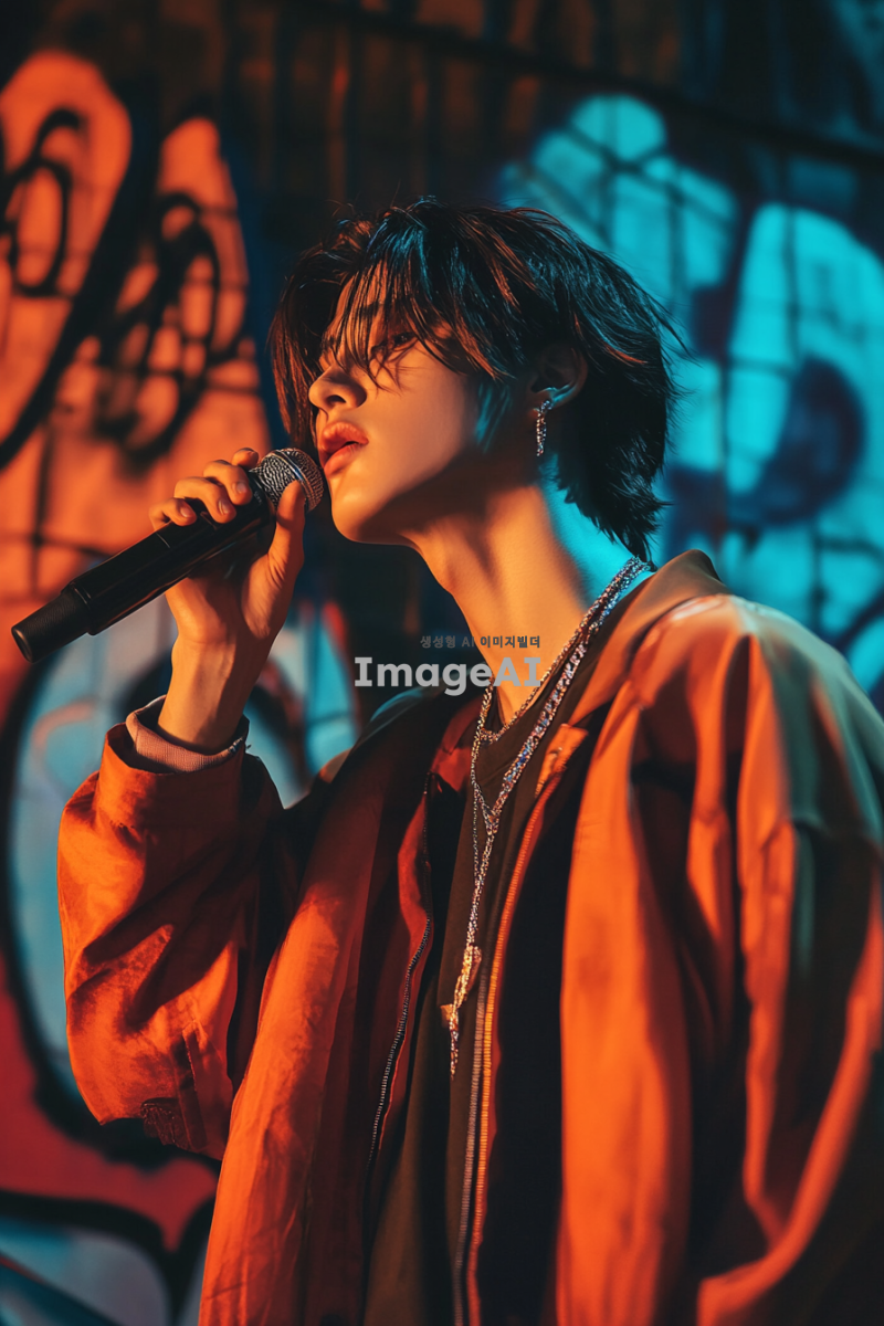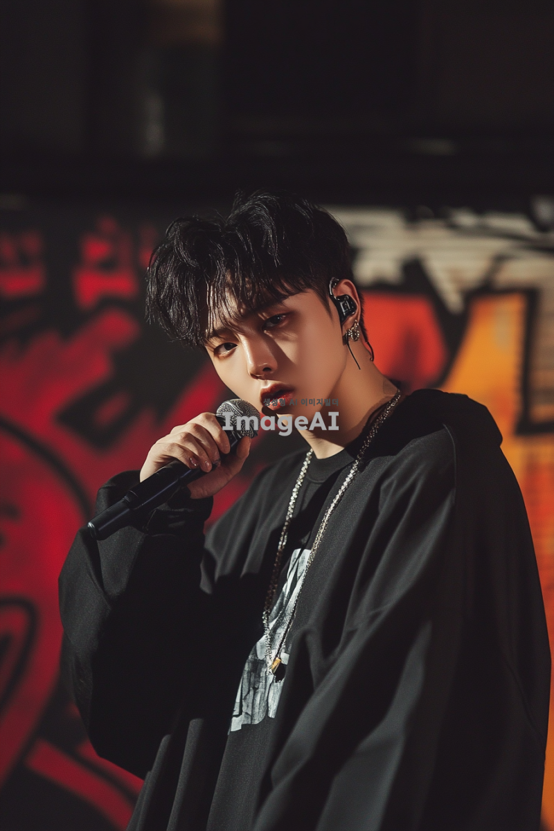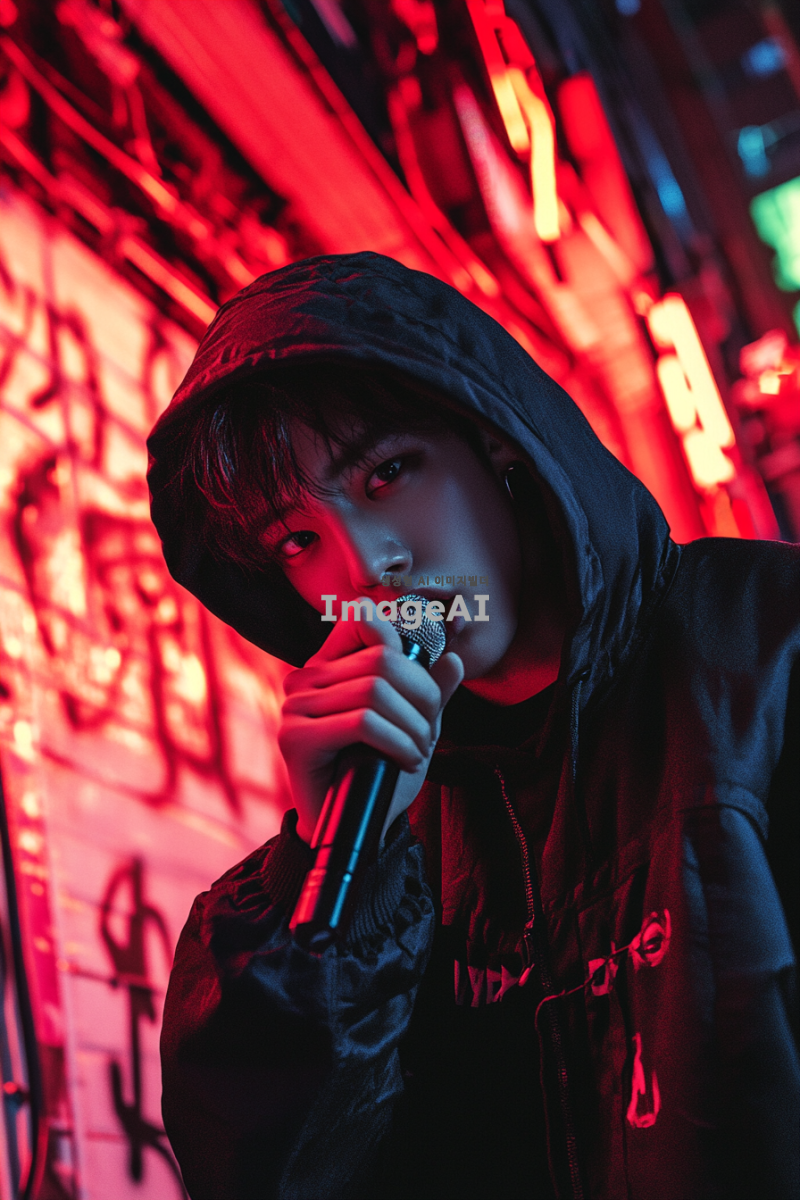 송은규, 한국의 랩퍼, 스튜디오에서 마이크를 잡고 있는 모습, 강렬한 표정, 힙합 스타일의 의상, 배경은 도시의 그래피티 벽, 조명이 어두운 밤, 에너지 넘치는 분위기, 음악에 몰입한 모습, 현대적인 느낌의 디지털 아트 스타일.