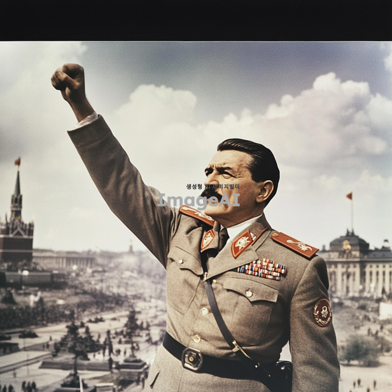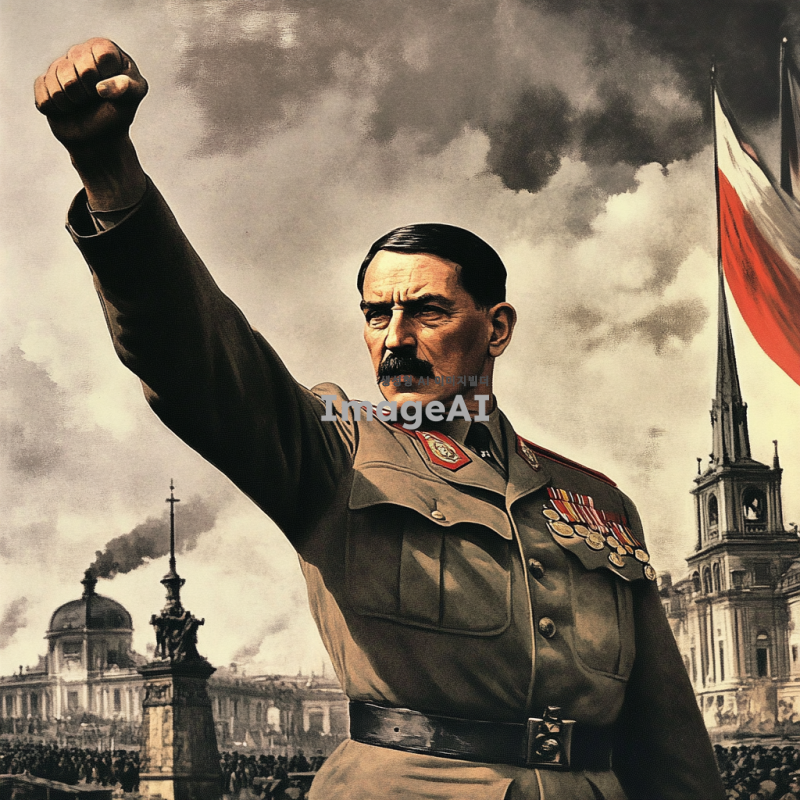 콧수염을 가진 독재자가 오른팔을 45도 각도로 들어올리고 있는 모습, 강렬한 표정과 카리스마 넘치는 자세, 군복을 입고 있으며 배경은 전쟁의 분위기가 느껴지는 도시 풍경, 강력한 권력을 상징하는 요소들이 포함된 이미지.
