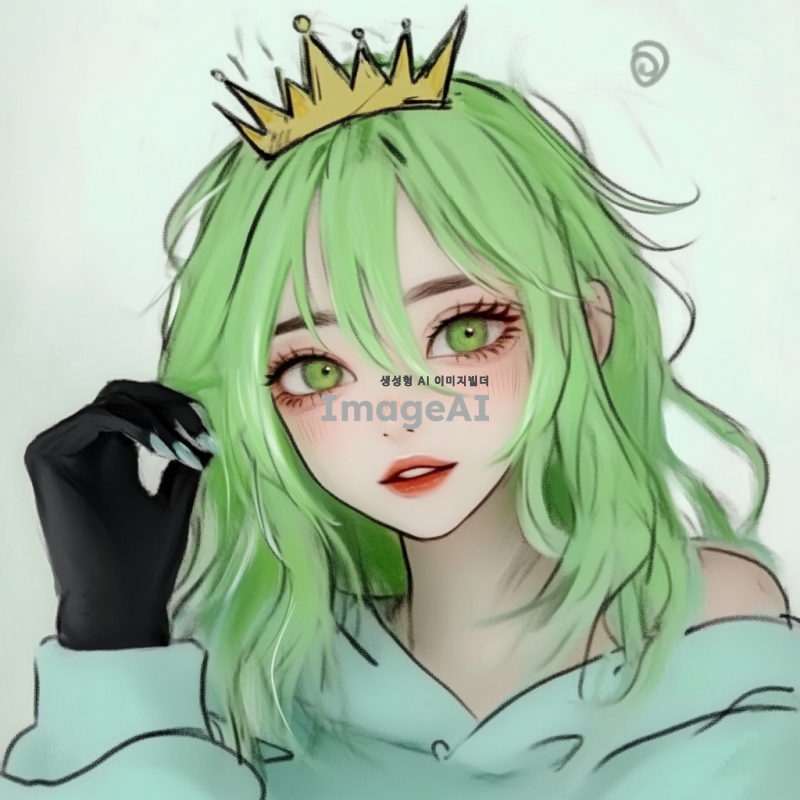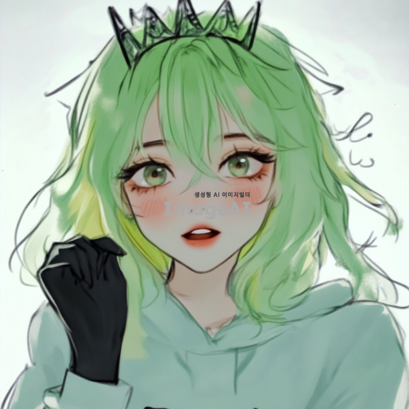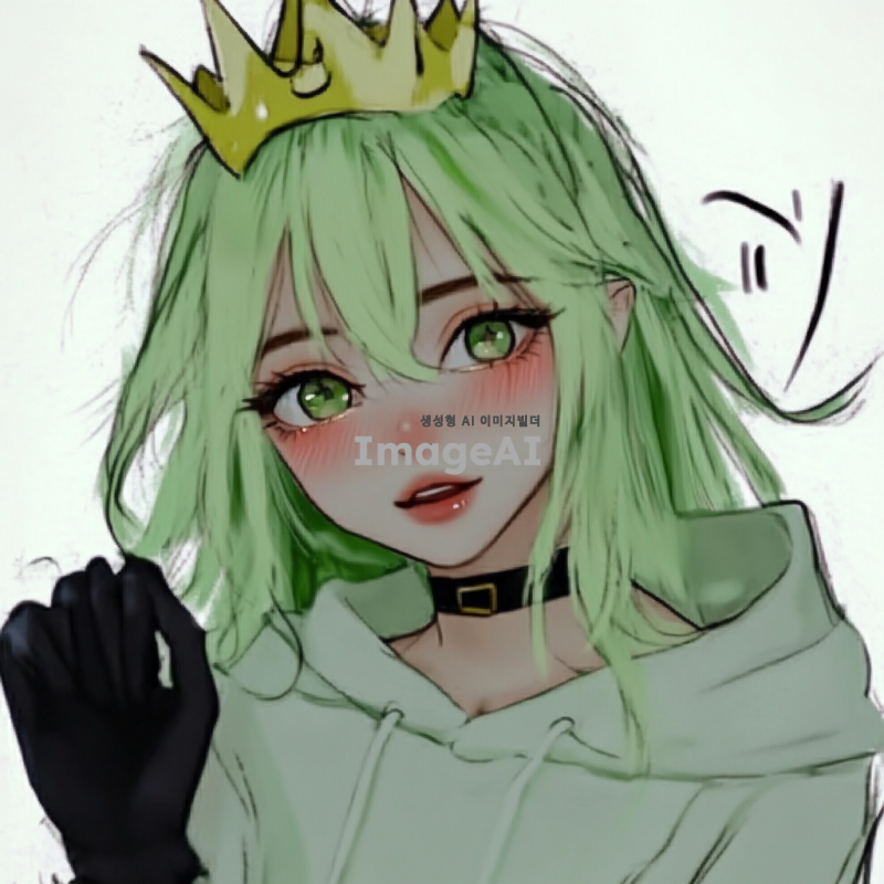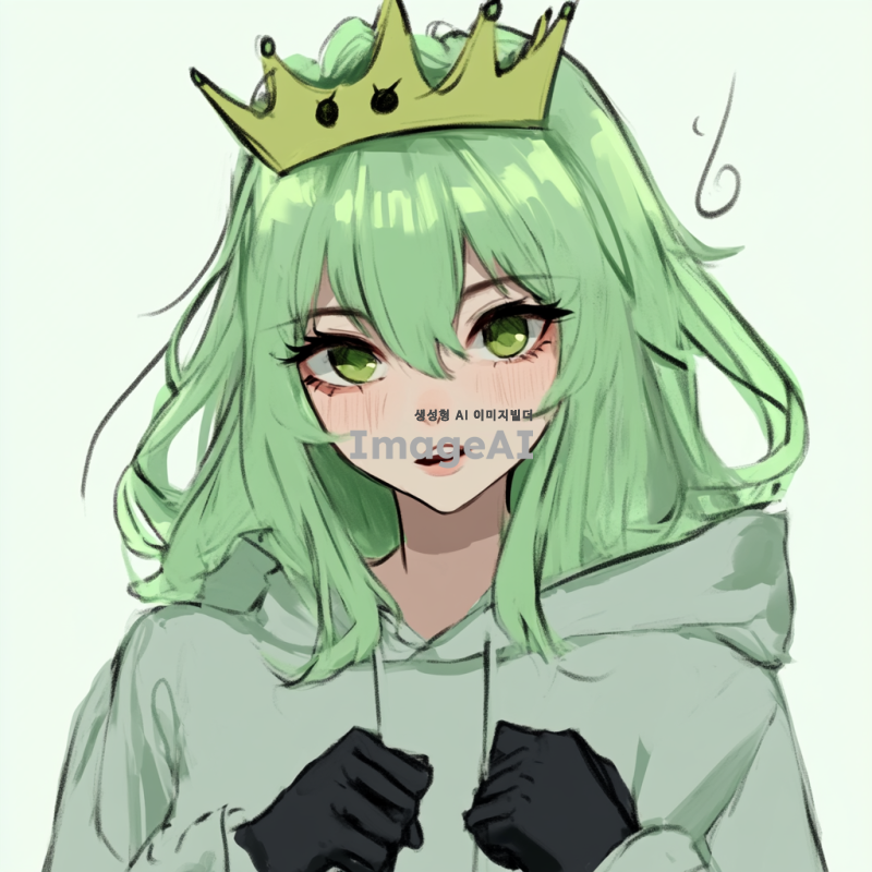머리는 연두색이고 왕관 머리 삔을 하고 있음. 표정은 귀엽고 볼터치가 되어있음.그리고 옷은 연두색 후드티를 하고 있고 손가락 뚫린 검은 장갑을 착용함.