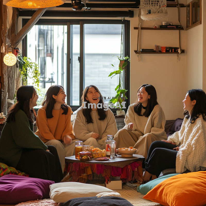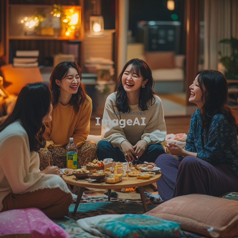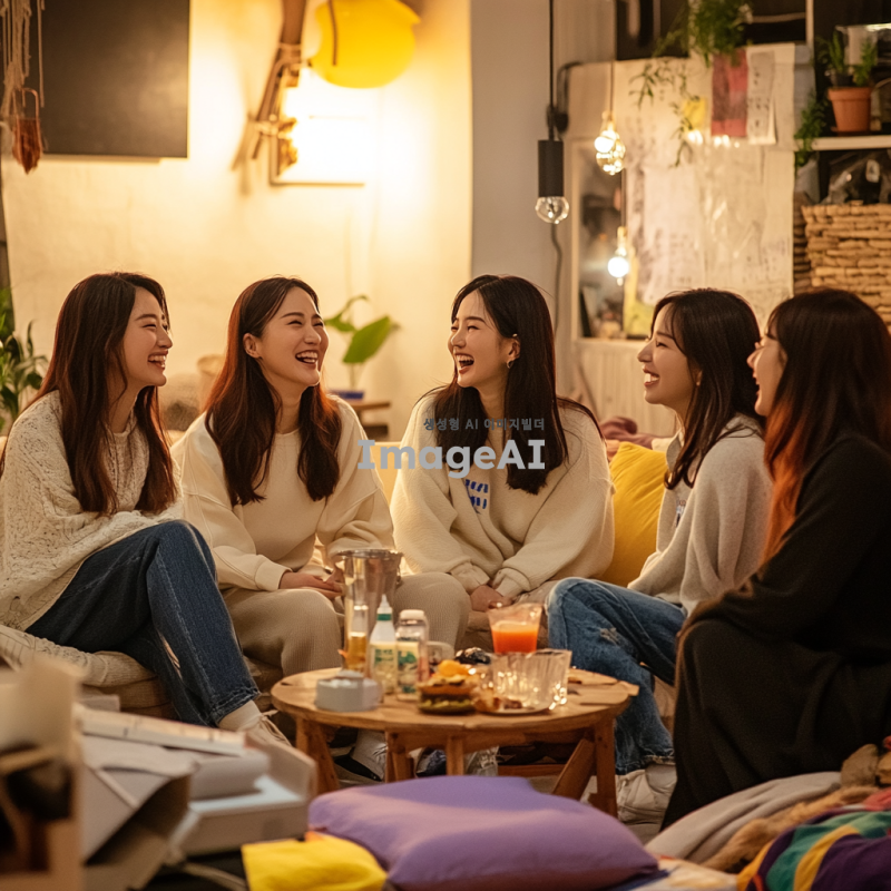 다섯 명의 한국인 여성들이 아늑한 거실에서 편안한 복장으로 앉아 수다를 떠는 모습. 다양한 색상의 쿠션과 따뜻한 조명이 있는 공간에서 웃고 이야기하며 즐거운 시간을 보내는 모습. 각자의 개성을 살린 헤어스타일과 표정을 지닌 여성들이 서로의 이야기에 귀 기울이고, 간식과 음료가 놓인 테이블이 함께 있는 장면.