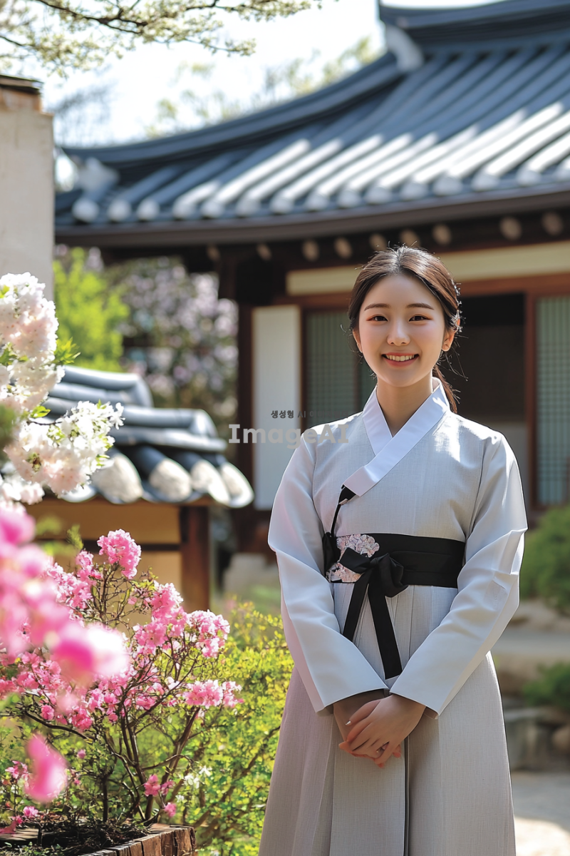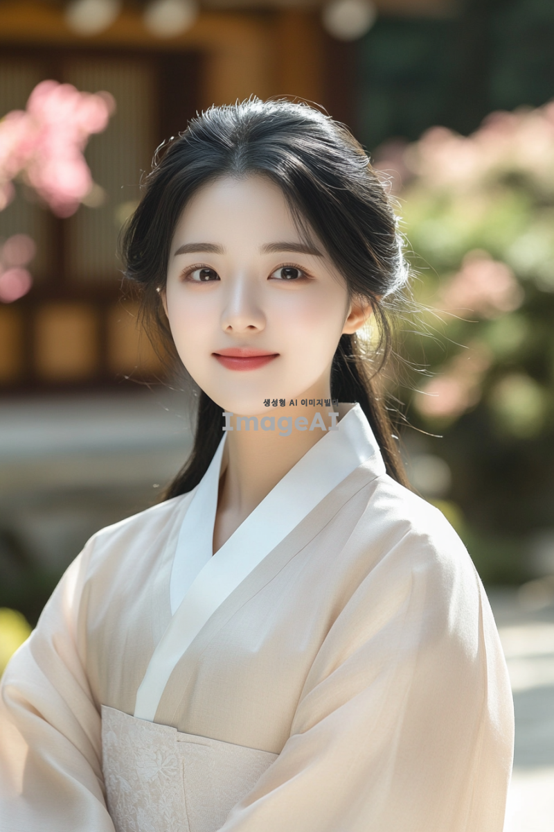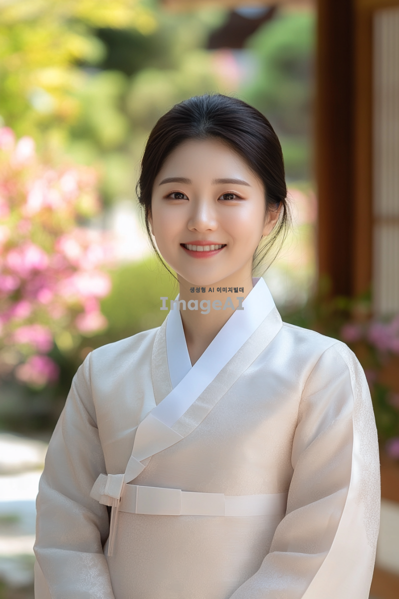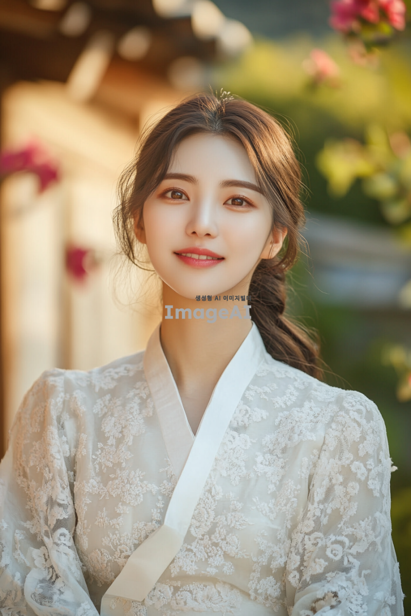 송은규, 한국의 전통 의상을 입고 있는 젊은 여성, 부드러운 자연광 속에서 전통 한옥 앞에 서 있는 모습, 따뜻한 미소와 함께 고요한 분위기를 연출, 배경에는 아름다운 정원과 꽃들이 만발해 있는 장면, 한국의 전통 문화를 느낄 수 있는 요소들 강조.