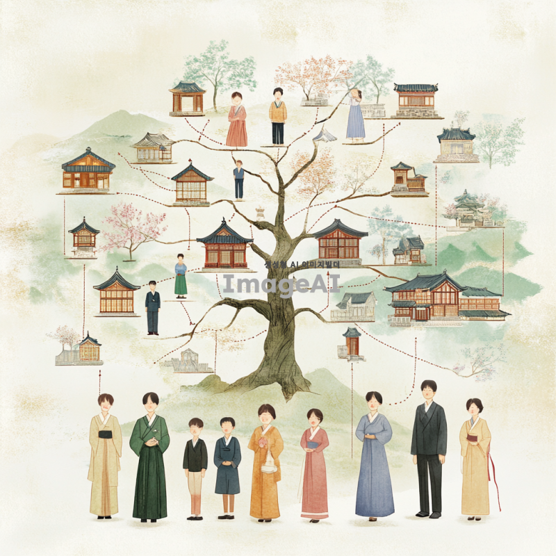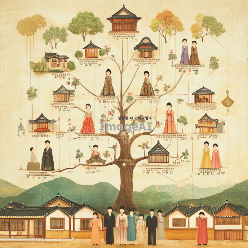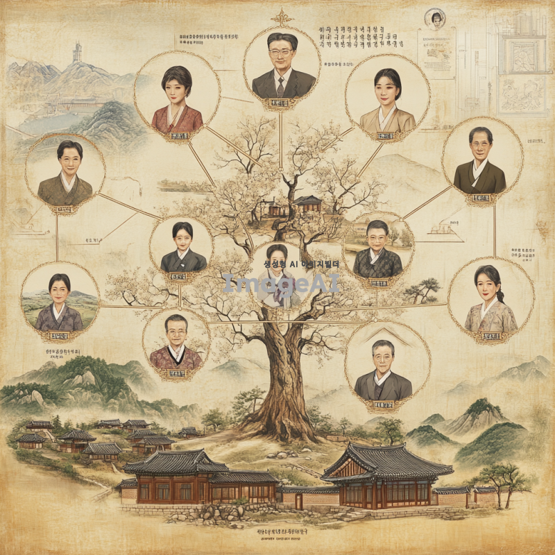 한국의 전통적인 가족 경영 승계도를 배경으로, 각 가족 구성원이 나무 형태로 연결된 모습. 중심에는 가족의 조상과 현재의 경영자, 그리고 다음 세대의 후계자가 위치해 있으며, 각 사람의 역할과 관계를 나타내는 선으로 연결됨. 가족 구성원들은 한국의 전통 의상을 입고 있으며, 배경에는 한국의 전통 가옥과 자연 풍경이 어우러져 있음. 전체적으로 따뜻하고 조화로운 분위기를 연출.