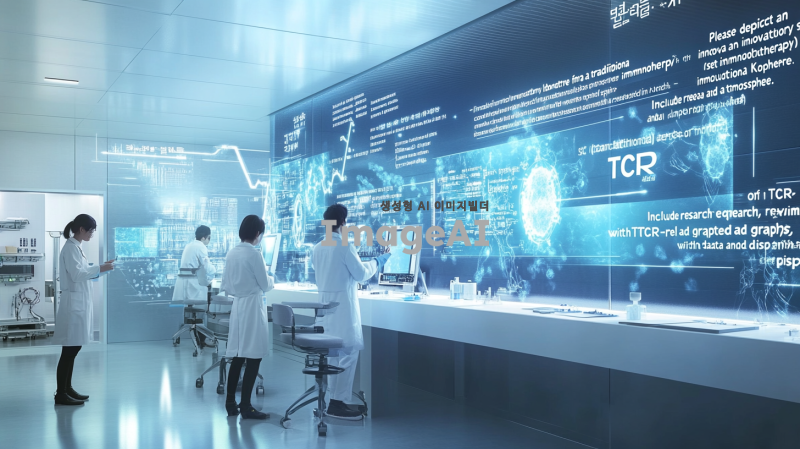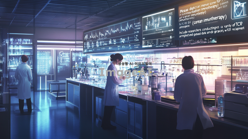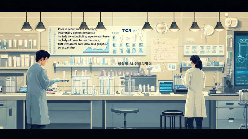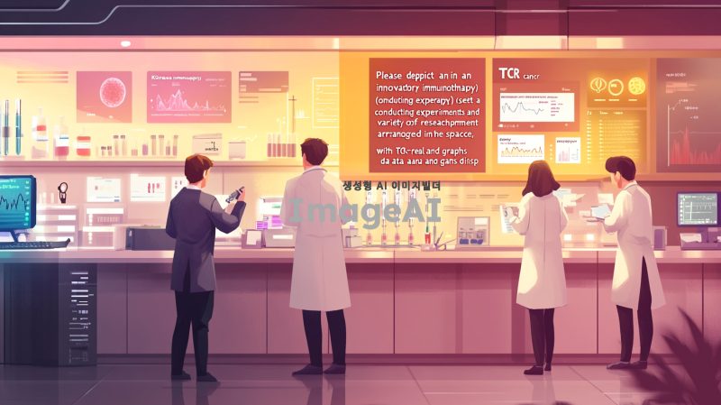 "한국의 전통적인 분위기 속에서 TCR(항암 치료제)의 혁신적인 연구실 풍경을 그려주세요. 연구자들이 실험을 진행하는 모습과 다양한 연구 장비들이 배치된 공간을 포함하며, 실험실의 벽에는 TCR 관련 데이터와 그래프가 디스플레이되고 있습니다. 연구자들은 집중하여 실험에 몰두하고 있으며, 실험실의 조명은 따뜻하고 현대적인 느낌을 주도록 해주세요."