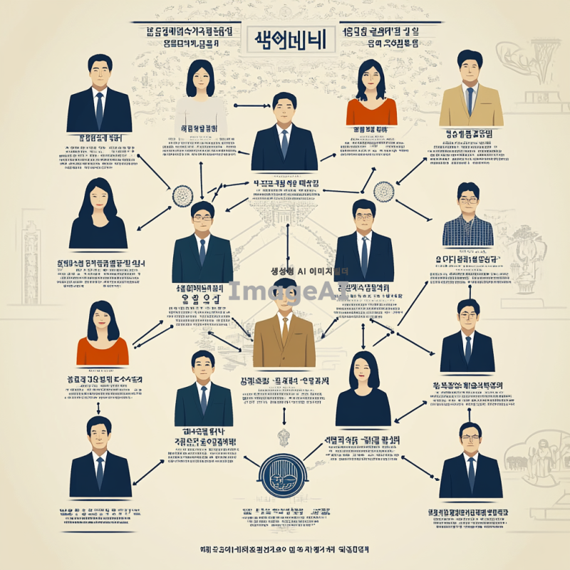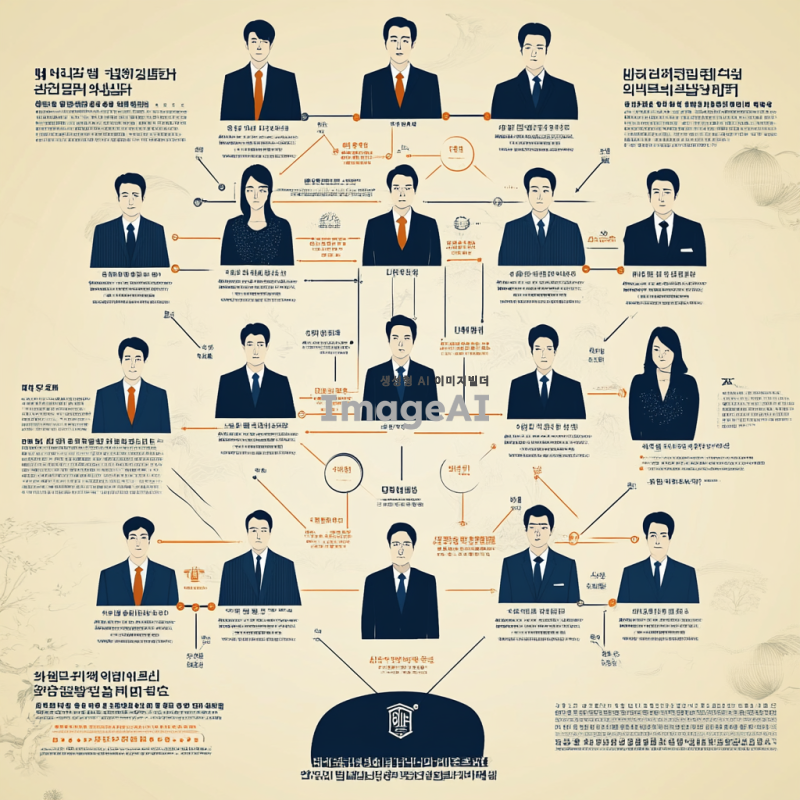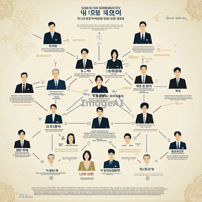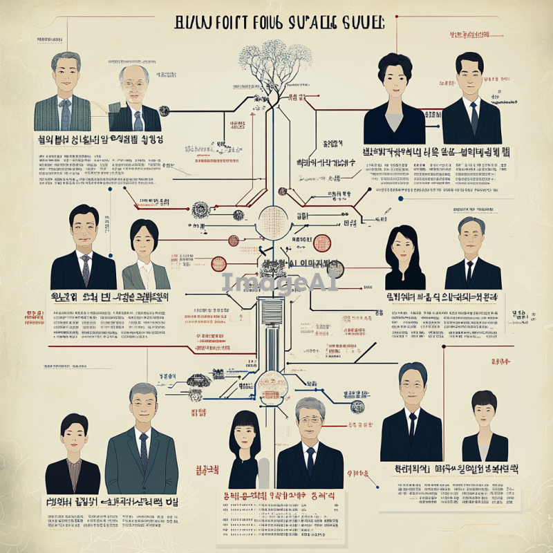 현대적인 스타일의 가족 경영 승계도를 제작하기 위해, 한국 대기업의 가족 구성원들이 서로 연결된 모습을 보여주는 디자인. 각 가족 구성원은 직책과 역할을 명확하게 나타내며, 세련된 색상과 깔끔한 레이아웃으로 구성. 배경은 미니멀리즘을 강조하고, 가족의 역사와 전통을 상징하는 요소를 포함. 전체적으로 전문적이고 현대적인 느낌을 주는 이미지.
