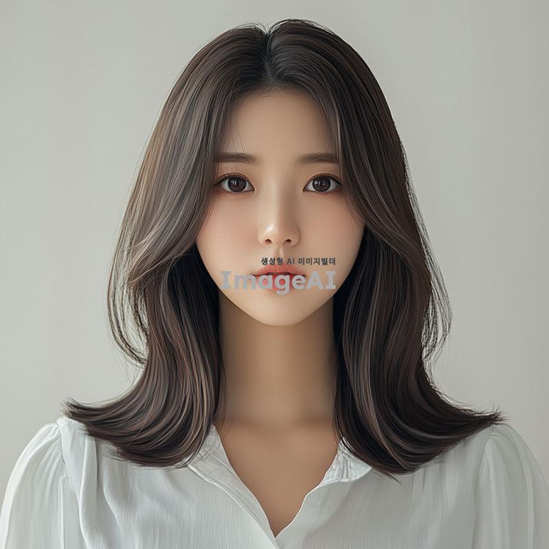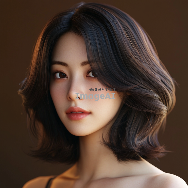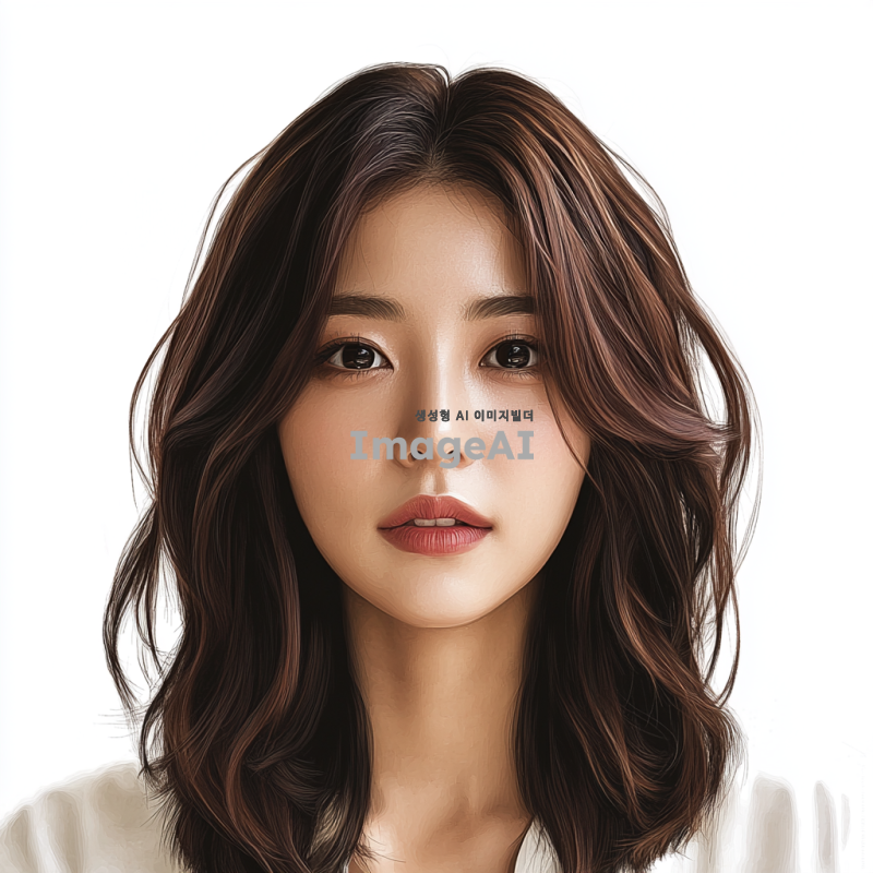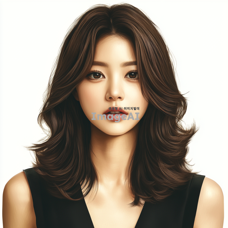 한국인 20대 여성 헤어모델, 어깨까지 오는 태슬컷 머리, 짙은 브라운 색상, 가슴선 위쪽에서 얼굴과 머리 스타일이 잘 보이도록 그린 이미지. 현실감 넘치는 스타일로 표현.