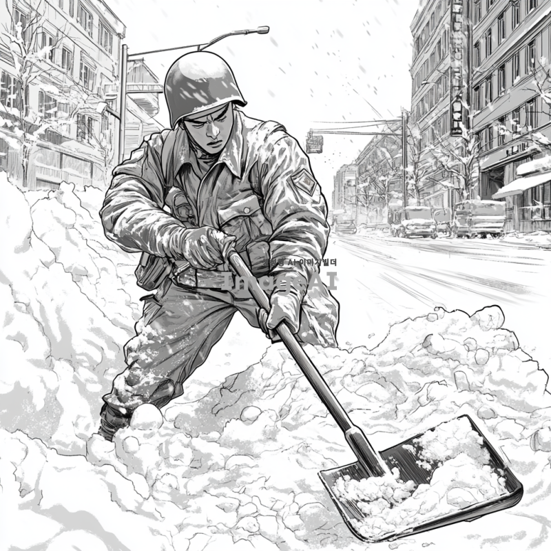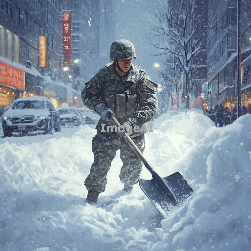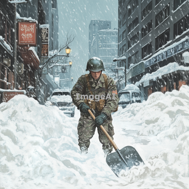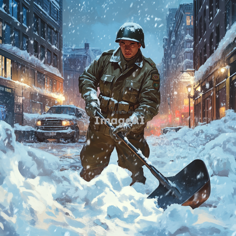 눈을 치우는 군인의 모습을 그려줘. 겨울철, 눈이 많이 내린 도시의 거리에서 군복을 입고 있는 한국 군인이 큰 삽으로 눈을 치우고 있는 장면. 주변에는 쌓인 눈과 함께 겨울 풍경이 펼쳐져 있고, 군인의 진지한 표정과 함께 눈을 치우는 모습이 강조되도록 해줘. 배경에는 눈 덮인 건물과 가로등이 보이며, 차가 지나가는 모습도 포함해줘.