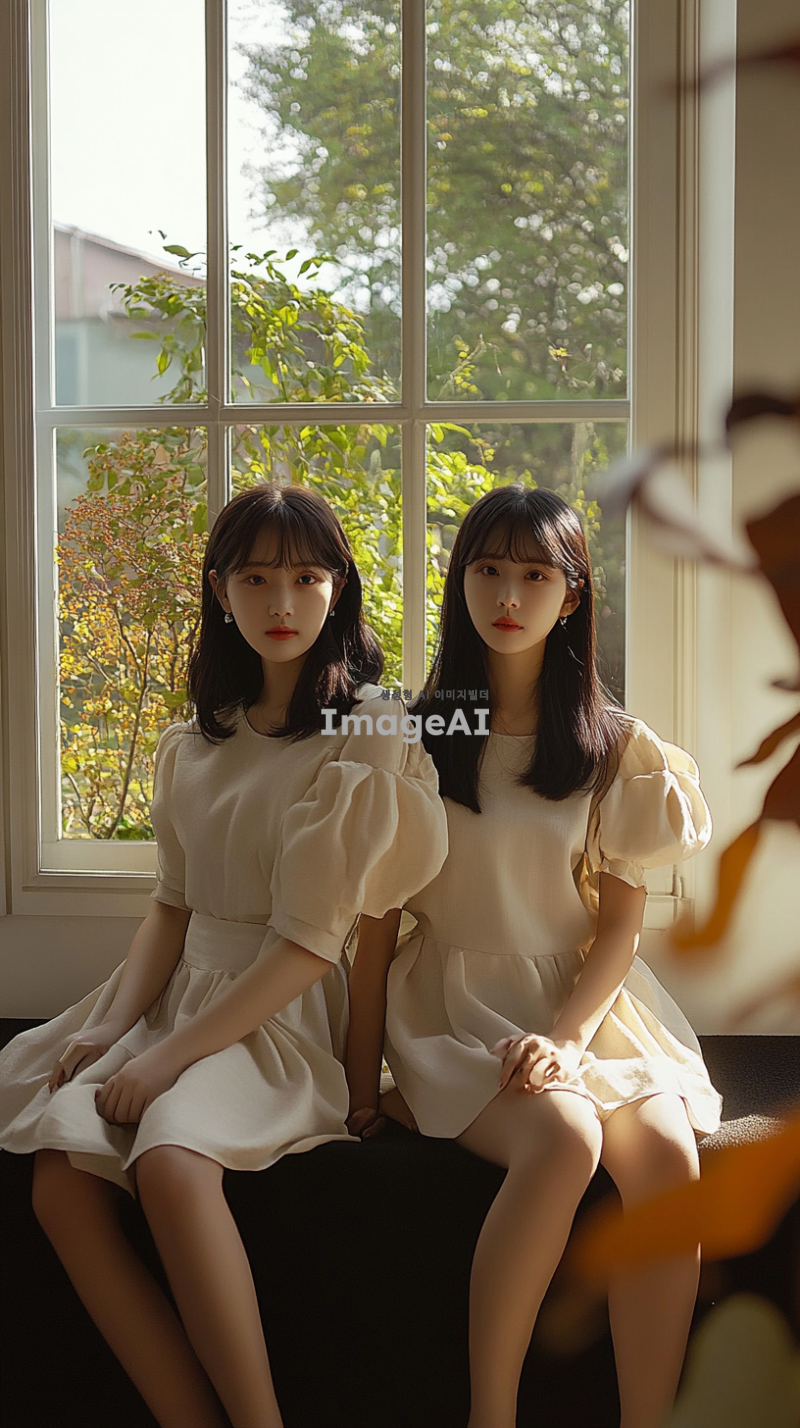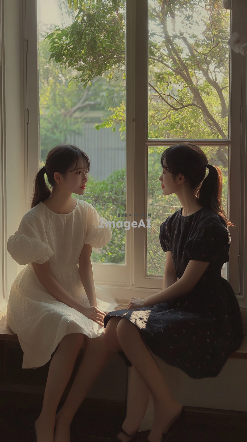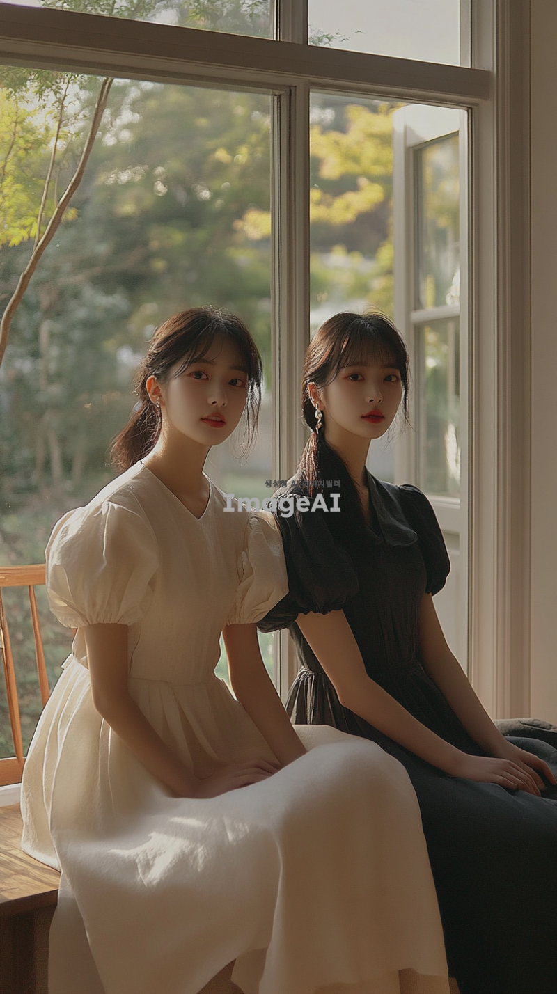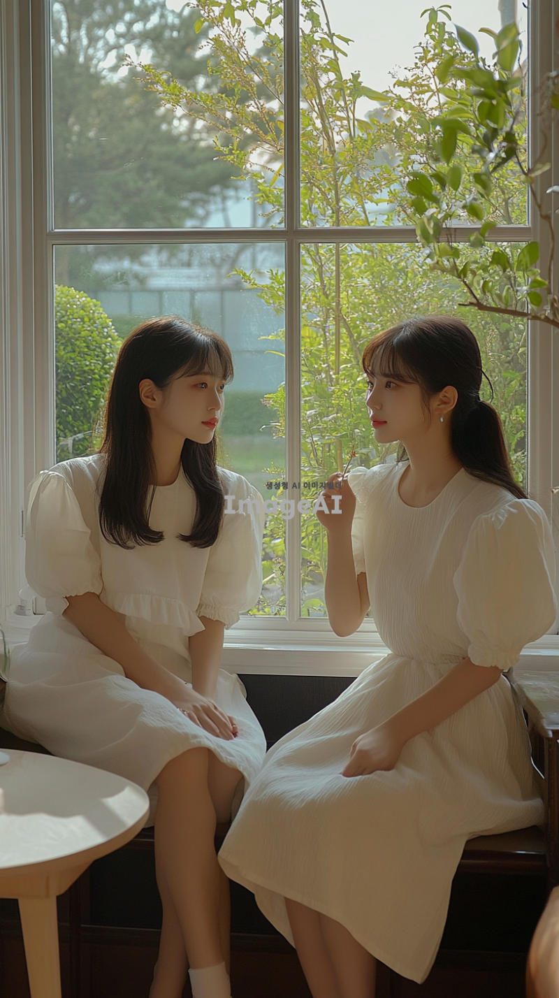 창가에 앉아있는 두 명의 한국 여성 모델, 미니 퍼프 원피스를 입고 있으며, 자연광이 부드럽게 들어오는 은은한 분위기, 배경에는 나무와 정원이 보이는 풍경