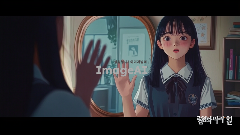한국 여고생의 방 안 큰 거울 앞에서, 한국 교복을 입은 검은 머리의 한국 여고생은 눈물을 흘리며 거울을 향해 손을 흔들어 인사하고 있다.