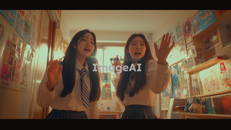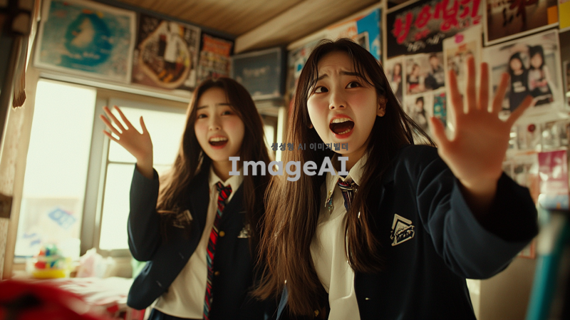 한국 여고생의 방 안, 큰 거울 앞에서 한국 교복을 입은 두 명의 한국 여자 모델이 있다. 한 명은 반묶음 머리 스타일을 하고 있고, 다른 한 명은 긴 머리 스타일을 하고 있다. 긴 머리 스타일을 한 여자의 뒤로 반묶음 스타일 여자가 비춰지며, 둘 다 눈물을 흘리고 있다. 손을 흔들어 인사하는 모습이 담겨 있다. 방 안은 아늑하고 따뜻한 분위기로 꾸며져 있으며, 벽에는 포스터와 사진들이 걸려 있다.