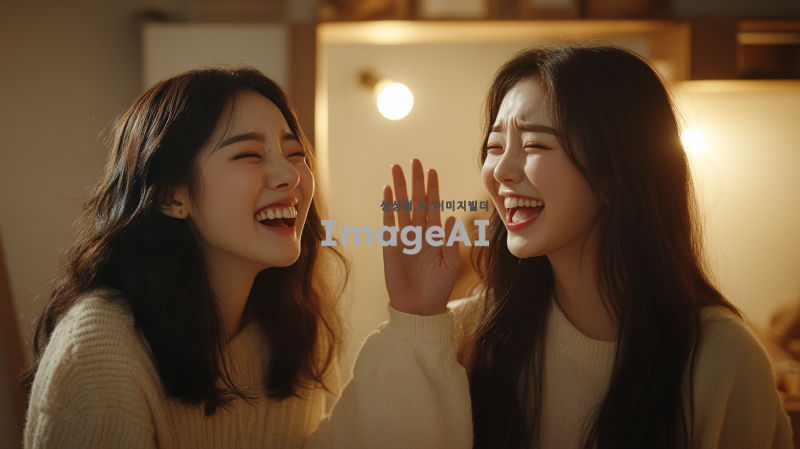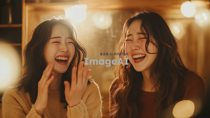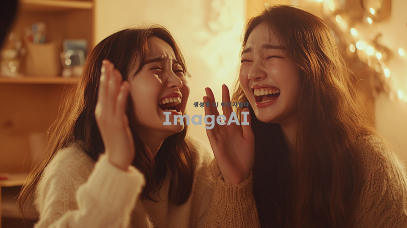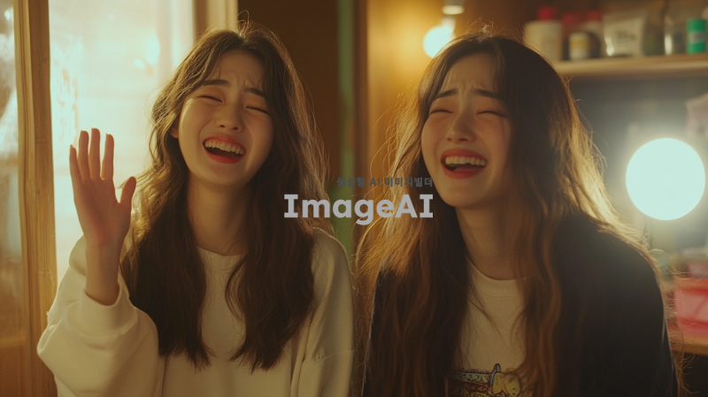 방 안의 거울 앞에 서 있는 두 명의 한국 여자 모델. 한 명은 반묶음 머리 스타일을 하고 있고, 다른 한 명은 긴 머리 스타일을 하고 있다. 둘 다 눈물을 흘리지만 웃으며 거울을 향해 손을 흔들어 인사하는 모습.