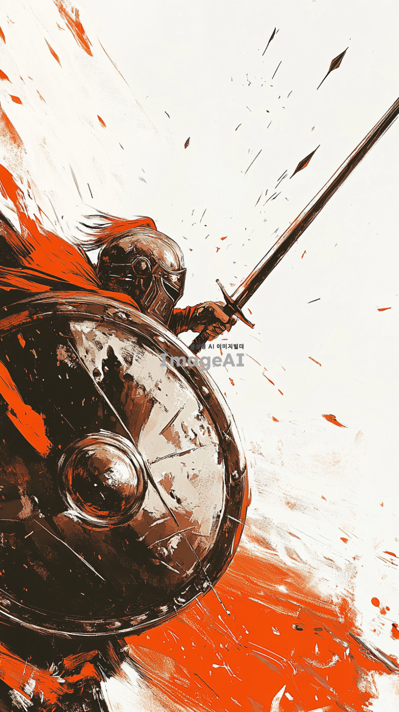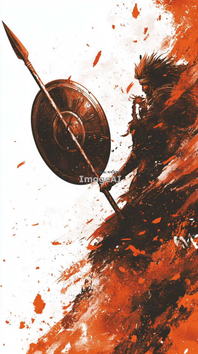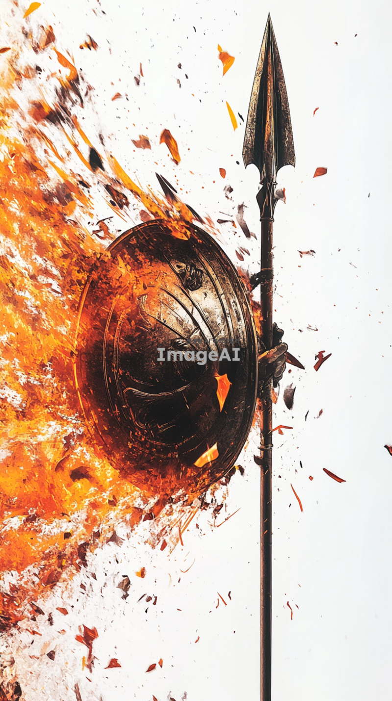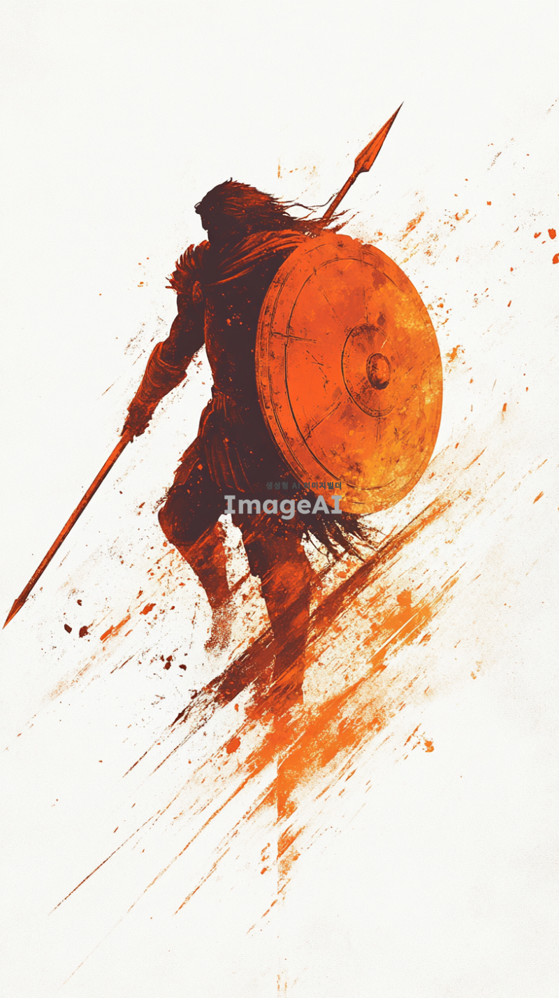 창과 방패가 격렬하게 싸우고 있는 모습, A4 크기의 표지 디자인. 배경은 흰색이며, 주황색을 베이스로 사용. 창과 방패의 디테일은 사실적으로 표현하고, 힘찬 전투의 느낌을 강조. 전체적인 분위기는 강렬하고 집중된 느낌을 주도록 디자인.