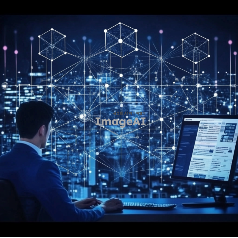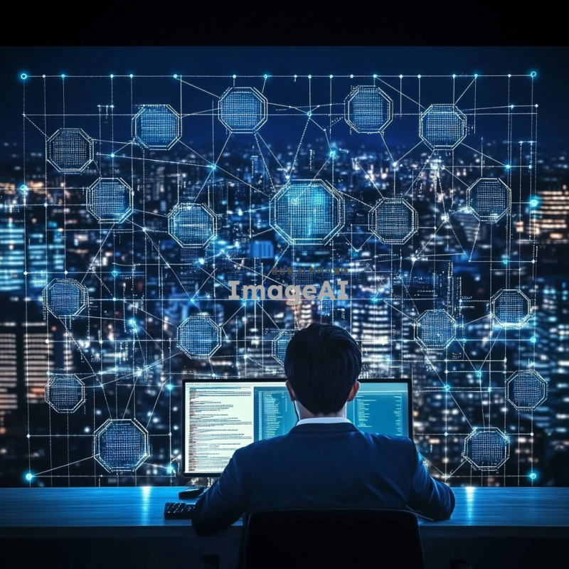 블록체인 기술을 시각적으로 표현한 이미지, 디지털 데이터가 연결된 네트워크, 블록들이 서로 연결되어 있는 모습, 현대적인 도시 배경, 미래적인 느낌, 파란색과 회색 톤의 색상 조화, 기술적인 요소들이 강조된 디자인, 한국인 개발자가 컴퓨터 앞에서 블록체인 시스템을 분석하고 있는 모습.