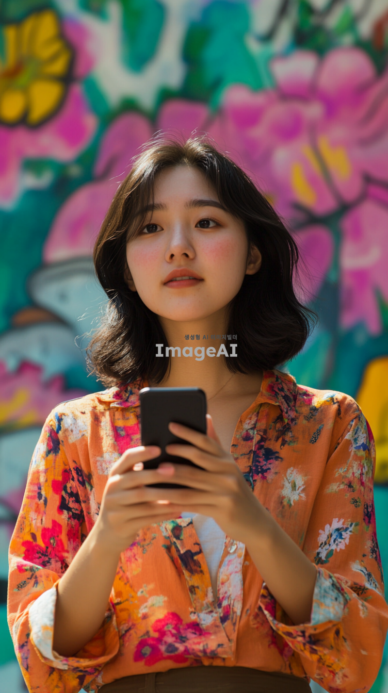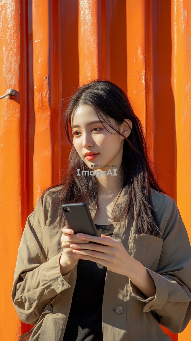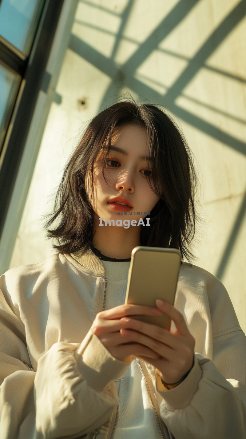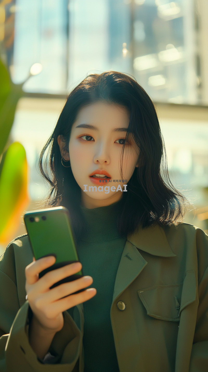 휴대폰을 사용하는 동양인 여성의 모습, 자연광 아래에서 편안한 표정으로 스마트폰을 들고 있는 모습, 캐주얼한 옷차림, 도시 배경, 현대적인 분위기, 생동감 있는 색감, 일상적인 상황