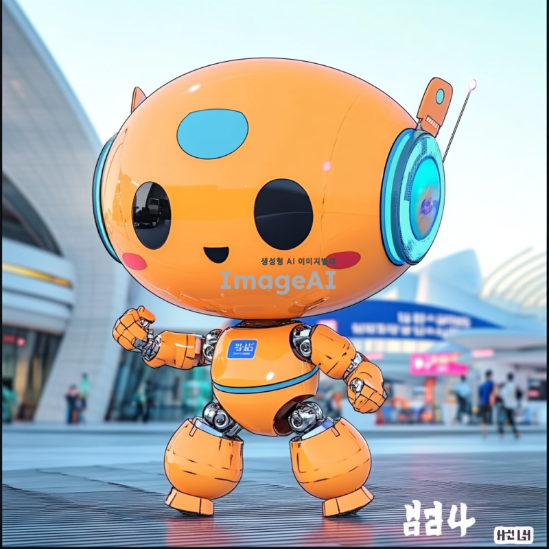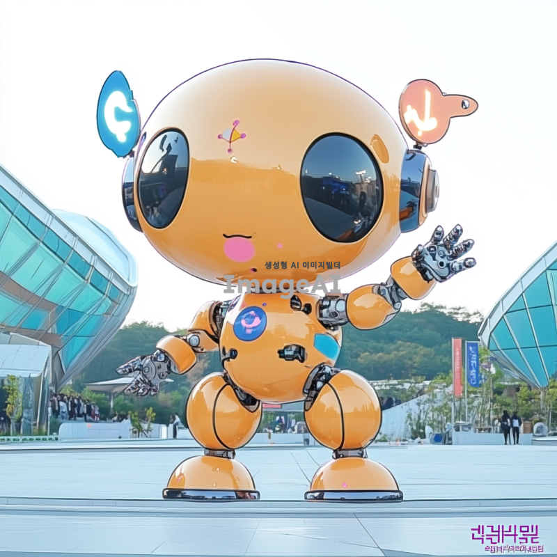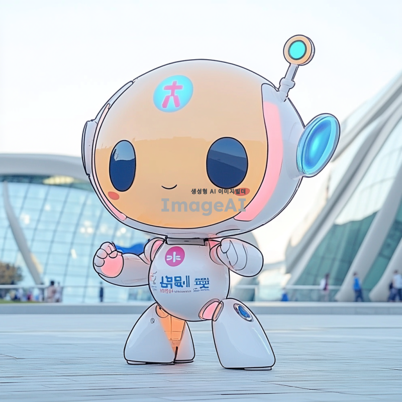 대전 엑스포 마스코트 꿈돌이를 현대적인 로봇 형태로 재구성한 이미지, 금속과 플라스틱 소재로 구성된 매끄러운 디자인, 밝은 색상과 미래적인 느낌을 강조, 배경은 대전 엑스포의 상징적인 건축물과 함께, 꿈돌이의 특징을 살리면서 고유의 로봇적 요소를 추가, 친근하고 유쾌한 표정으로 관람객을 맞이하는 모습.