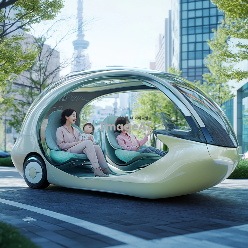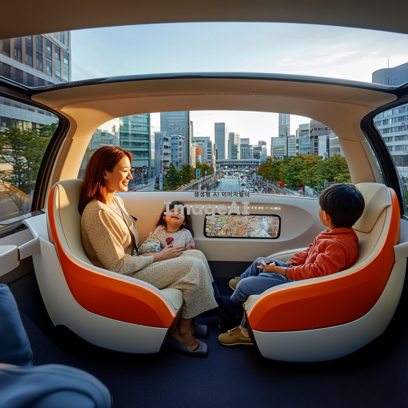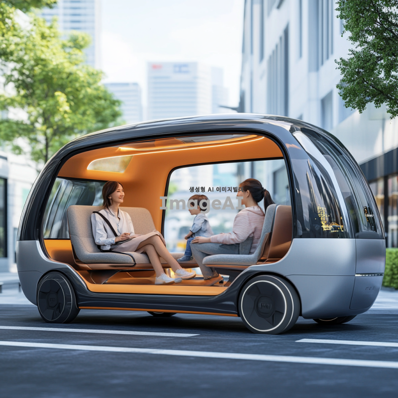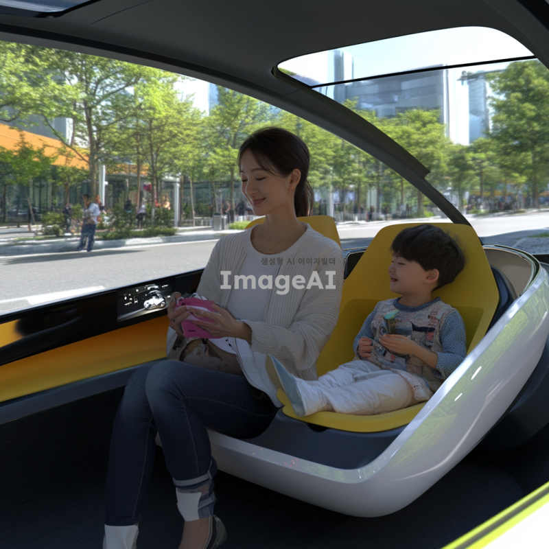 40대 한국인 여성과 어린이가 함께 탑승할 수 있는 안전하고 세련된 자율 주행 자동차의 디자인. 자동차는 현대적이고 미래적인 외관을 가지고 있으며, 내부는 넓고 편안한 좌석과 최신 기술이 적용된 기능들로 가득 차 있다. 외부 색상은 밝고 화사하며, 주변 환경과 잘 어우러지는 모습. 자동차 주변에는 평화로운 도심 풍경이 펼쳐져 있다.