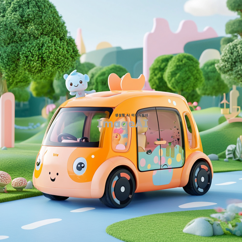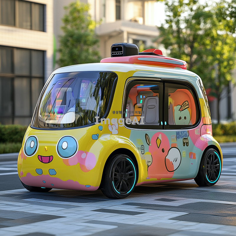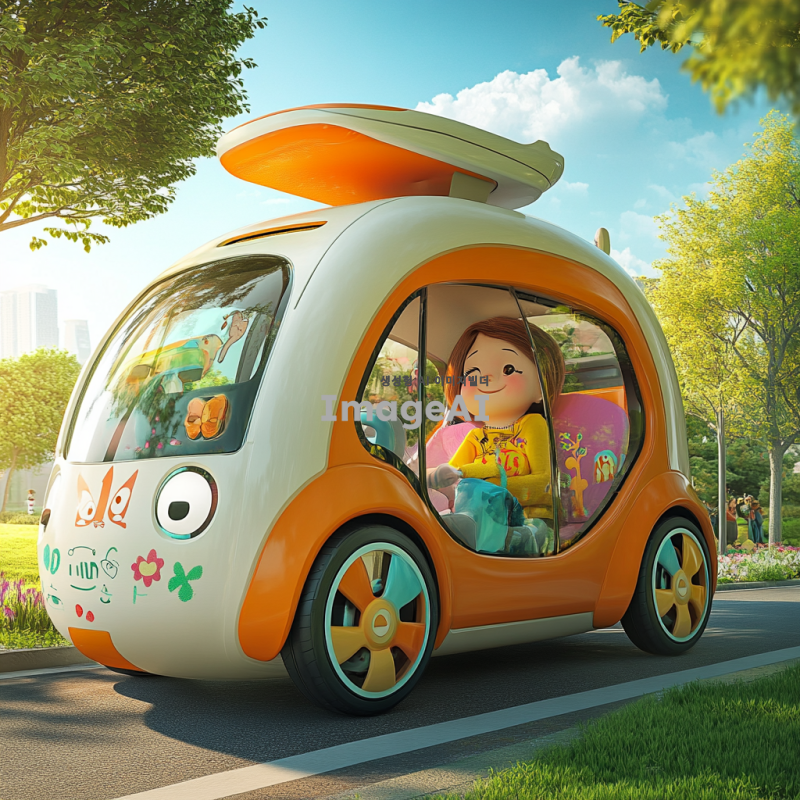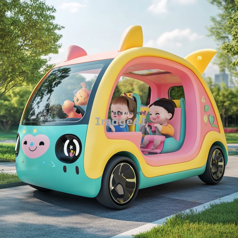 아이가 좋아할 디자인의 자율주행 자동차, 안전하고 세련된 외관, 밝고 화사한 색상, 귀여운 캐릭터와 패턴, 넓은 내부 공간, 다양한 엔터테인먼트 기능이 있는 모습, 주변 경관과 조화롭게 어우러진 장면.